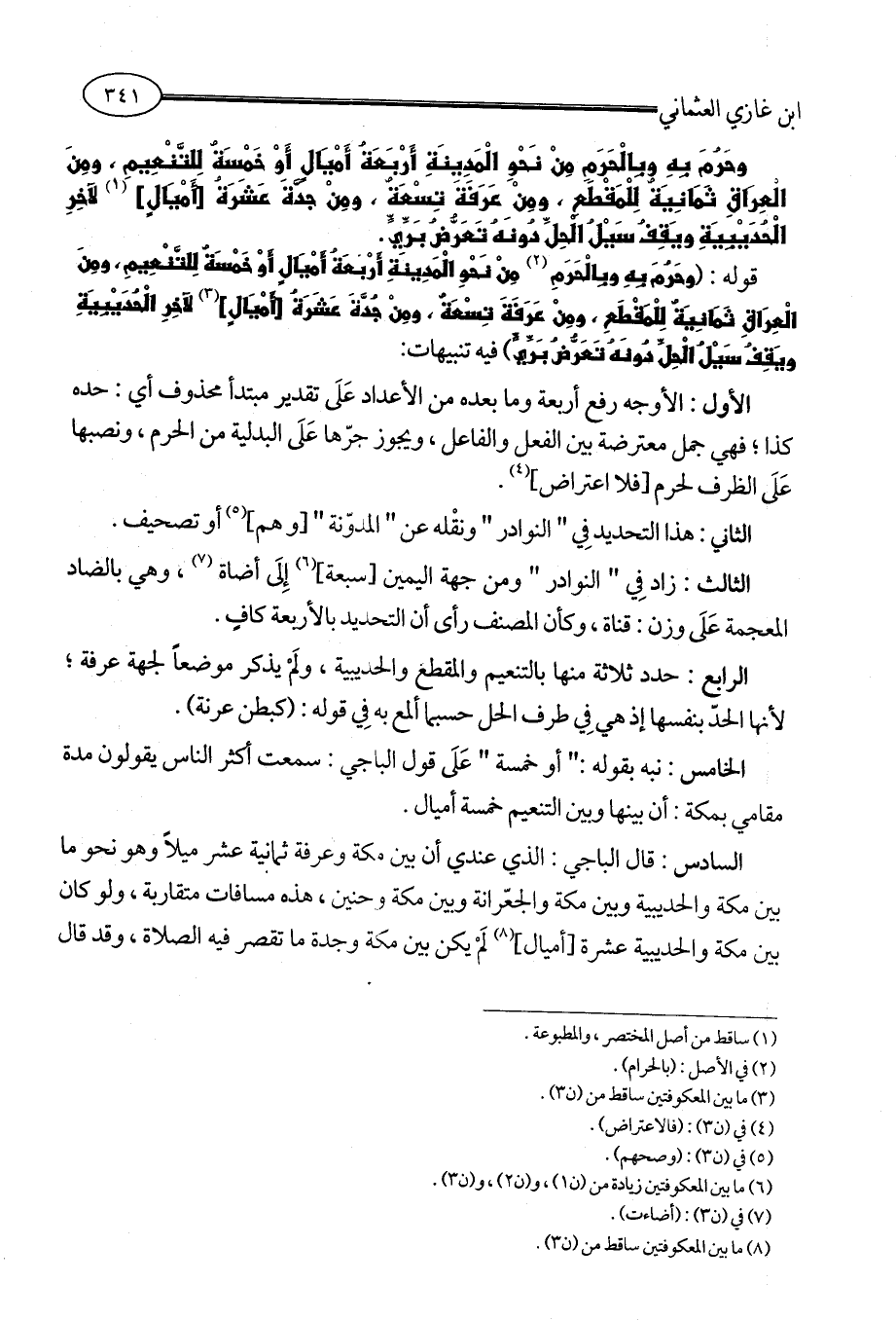 السادس: قال الباجي: الذي عندي أن بين مكة وعرفة ثمانية عشر ميلاً وهو نحو ما بين مكة والحديبية وبين مكة والجعّرانة وبين مكة وحنين، هذه مسافات متقاربة، ولو كان بين مكة والحديبية عشرة [أميال] (¬8) لَمْ يكن بين مكة وجدة ما تقصر فيه الصلاة، وقد قال