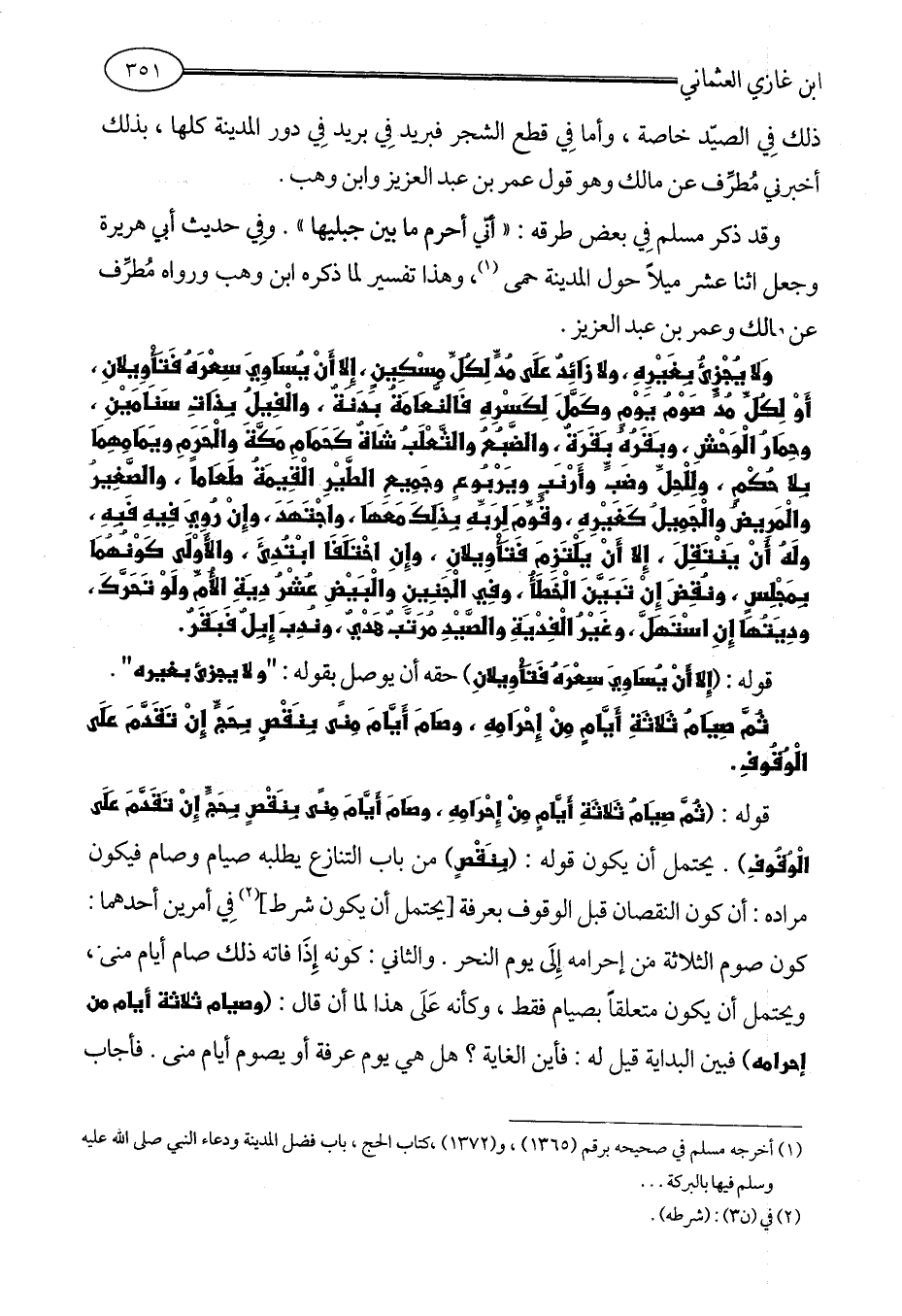 قوله: (ثُمَّ صِيَامُ ثَلاثَةِ أَيَّامٍ مِنْ إِحْرَامِهِ، وصَامَ أَيَّامَ مِنًى بِنَقْصٍ بِحَجٍّ إِنْ تَقَدَّمَ عَلَى الْوُقُوفِ). يحتمل أن يكون قوله: (بِنَقْصٍ) من باب التنازع يطلبه صيام وصام فيكون مراده: أن كون النقصان قبل الوقوف بعرفة [يحتمل أن يكون شرط] (¬2) فِي أمرين أحدهما: كون صوم الثلاثة من إحرامه إِلَى يوم النحر. والثاني: كونه إِذَا فاته ذلك صام أيام منى، ويحتمل أن يكون متعلقاً بصيام فقط، وكأنه عَلَى هذا لما أن قال: (وصيام ثلاثة أيام من إحرامه) فبين البداية قيل له: فأين الغاية؟ هل هي يوم عرفة أو يصوم أيام منى. فأجاب