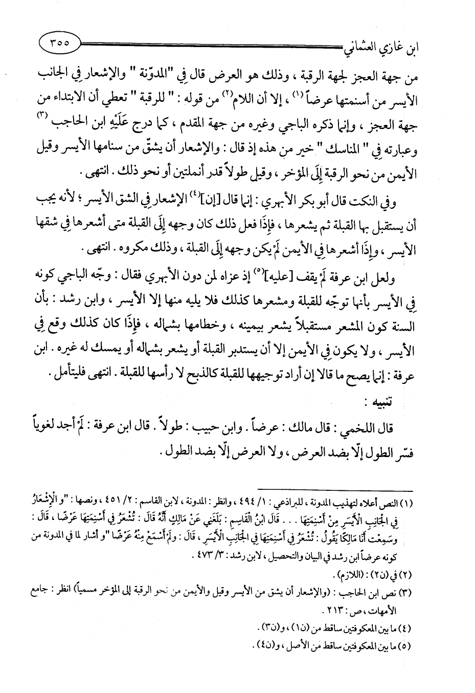 (¬3) نص ابن الحاجب: (والإشعار أن يشق من الأيسر وقيل والأيمن من نحو الرقبة إلى المؤخر مسمياً) انظر: جامع الأمهات، ص: 213.