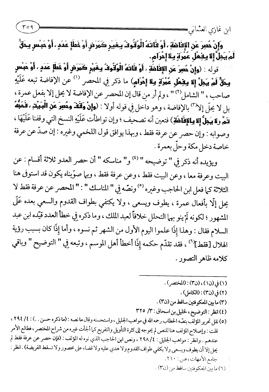 (¬5) نقل تحرير المؤلف بنصّه الحطاب رحمه الله في مواهب الجليل، واستحسنه وقال ما نصه: (ما ذكره حسن. .): 4/ 294، قلت: وإصلاح المؤلف هنا للنص لم يحوجه إلى كثرة التأويل والتفريع كما ألجأت غيره من شراح المختصر، فطالع الأمر عندهم. وانظر: مواهب الجليل: 4/ 298، ونص ابن الحاجب الذي نوه له المؤلف: (فإن حصر عن عرفة فقط لم يحل إلا أن يطوف ويسعى ولا يكفي طواف القدوم ولا هدي عليه ولا قضاء على محصور ولا تسقط الفريضة). انظر: جامع الأمهات، ص: 210.