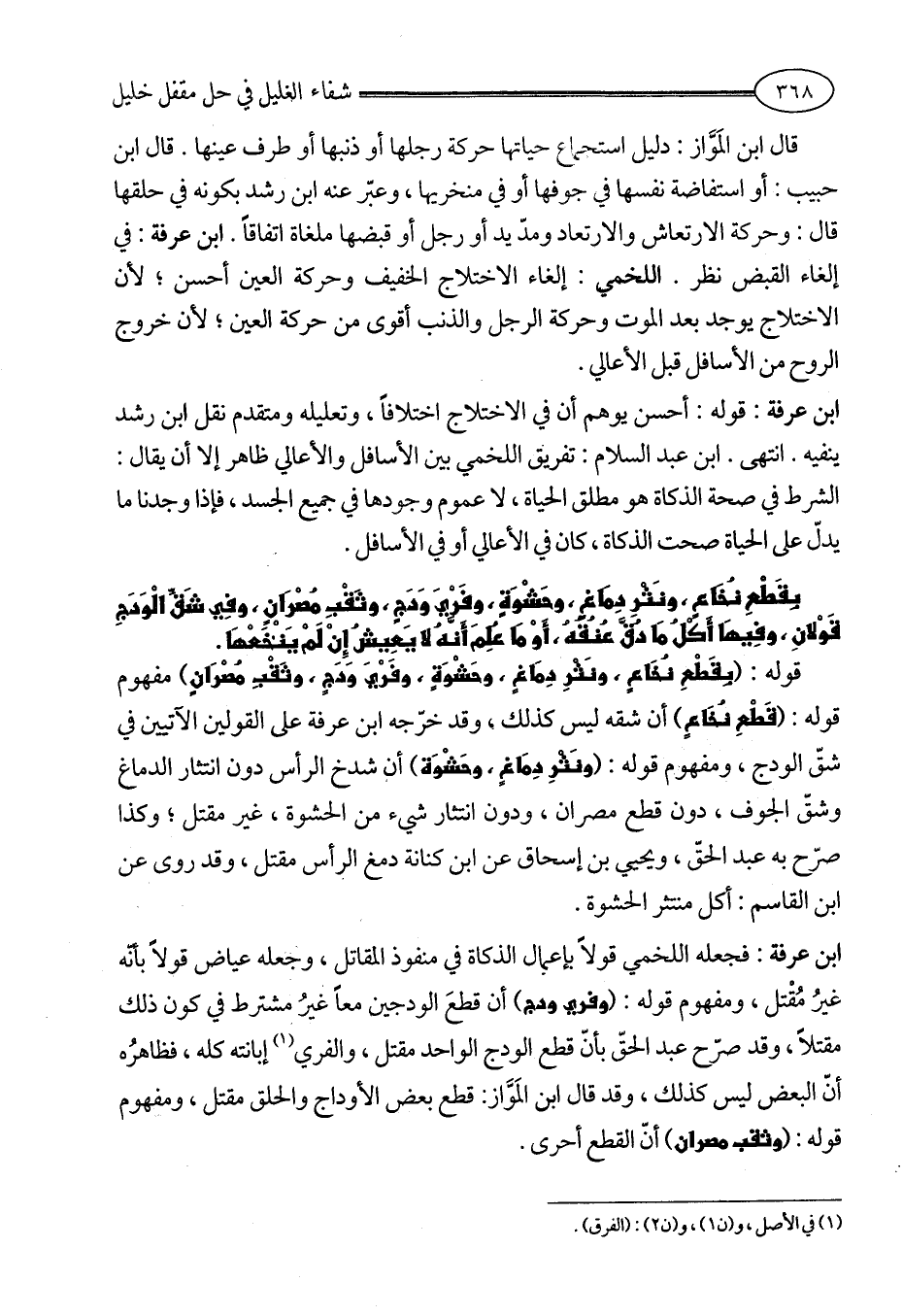 ابن عرفة: فجعله اللخمي قولاً بإعمال الذكاة في منفوذ المقاتل، وجعله عياض قولاً بأنّه غيرُ مُقْتل، ومفهوم قوله: (وفري ودج) أن قطعَ الودجين معاً غيرُ مشترط في كون ذلك مقتلاً، وقد صرّح عبد الحقّ بأنّ قطع الودج الواحد مقتل، والفري (¬1) إبانته كله، فظاهرُه أنّ البعض ليس كذلك، وقد قال ابن المَوَّاز: قطع بعض الأوداج والحلق مقتل، ومفهوم قوله: (وثقب مصران) أنّ القطع أحرى.