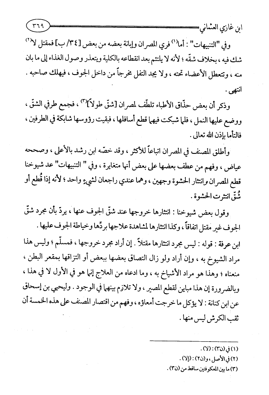 وقول بعض شيوخنا: انتثارها خروجها عند شقّ الجوف عنها، يردّ بأن مجرد شقّ الجوف غير مقتل اتفاقاً، وكذا انتثارها لمشاهدة علاجها بردِّها وخياطة الجوف عليها.