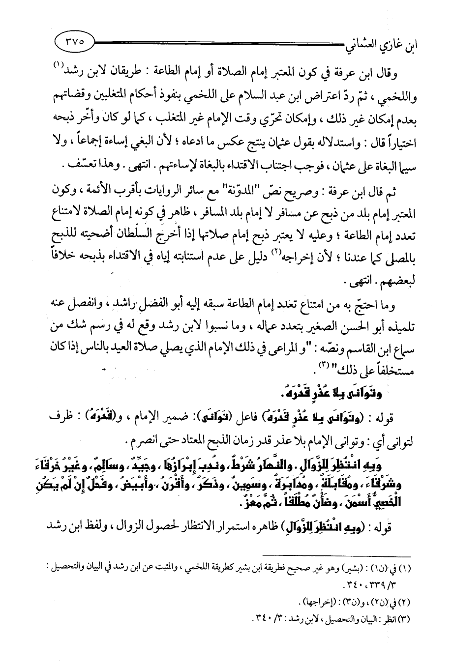 وما احتجّ به من امتناع تعدد إمام الطاعة سبقه إليه أبو الفضل راشد، وانفصل عنه تلميذه أبو الحسن الصغير بتعدد عماله، وما نسبوا لابن رشد وقع له في رسم شك من سماع ابن القاسم ونصّه: " والمراعى في ذلك الإمام الذي يصلي صلاة العيد بالناس إذا كان مستخلفاً على ذلك " (¬3).