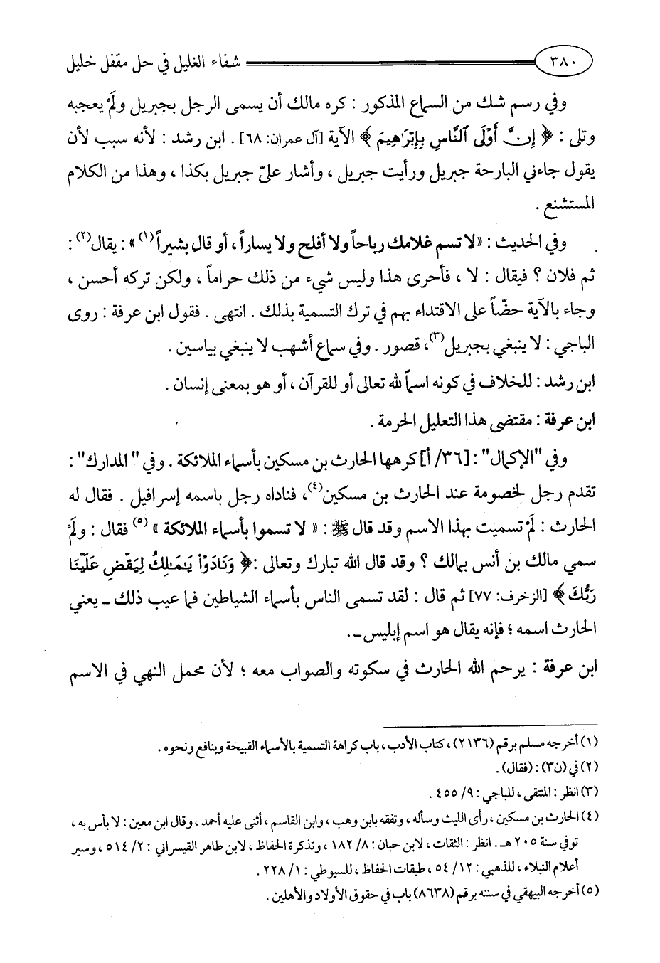 وفي " الإكمال ": [36 / أ] كرهها الحارث بن مسكين بأسماء الملائكة. وفي " المدارك ": تقدم رجل لخصومة عند الحارث بن مسكين (¬4)، فناداه رجل باسمه إسرافيل. فقال له الحارث: لَمْ تسميت بهذا الاسم وقد قال - صلى الله عليه وسلم -: " لا تسموا بأسماء الملائكة " (¬5) فقال: ولَمْ سمي مالك بن أنس بمالك؟ وقد قال الله تبارك وتعالى: {وَنَادَوْا يَا مَالِكُ لِيَقْضِ عَلَيْنَا رَبُّكَ} [الزخرف: 77] ثم قال: لقد تسمى الناس بأسماء الشياطين فما عيب ذلك - يعني الحارث اسمه؛ فإنه يقال هو اسم إبليس -.