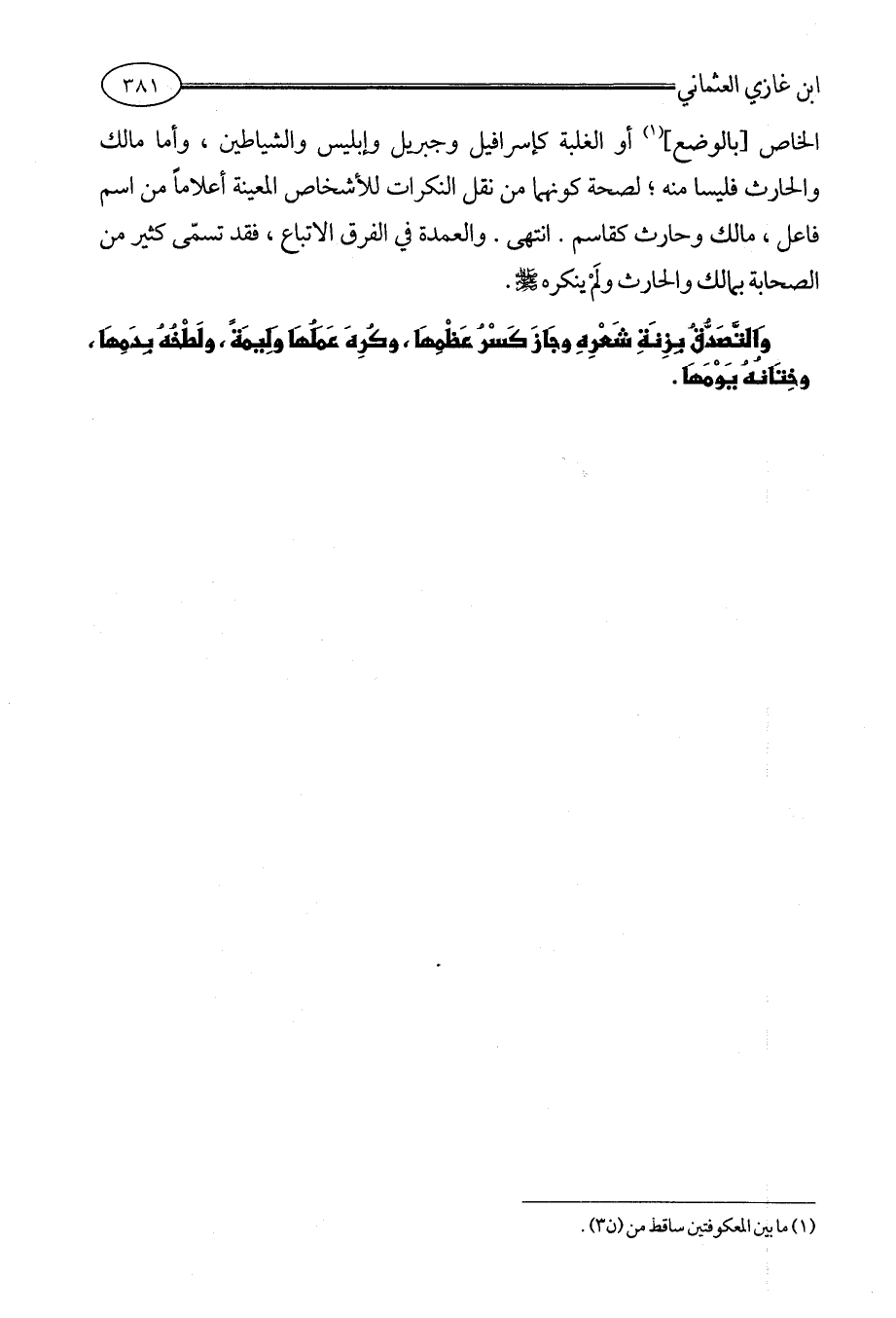 الخاص [بالوضع] (¬1) أو الغلبة كإسرافيل وجبريل وإبليس والشياطين، وأما مالك والحارث فليسا منه؛ لصحة كونهما من نقل النكرات للأشخاص المعينة أعلاماً من اسم فاعل، مالك وحارث كقاسم. انتهى. والعمدة في الفرق الاتباع، فقد تسمّى كثير من الصحابة بمالك والحارث ولَمْ ينكره - صلى الله عليه وسلم -