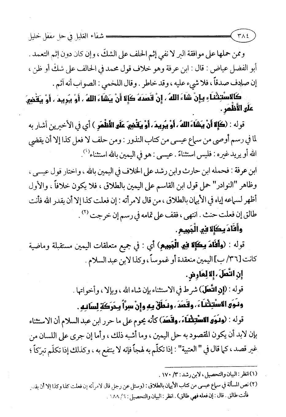 ابن عرفة: فحمله ابن حارث وابن رشد على الخلاف في اليمين بالله، واختار قول عيسى، وظاهر " النوادر " حمل قول ابن القاسم على اليمين بالطلاق، فلا يكون خلافاً، والأول أظهر لسماعه إياه في الأيمان بالطلاق، من قال لامرأته: إن فعلت كذا إلا أن يقدر الله فأنت طالق إن فعلت حنث. انتهى، فقف على تمامه في رسم إن خرجت (¬2).