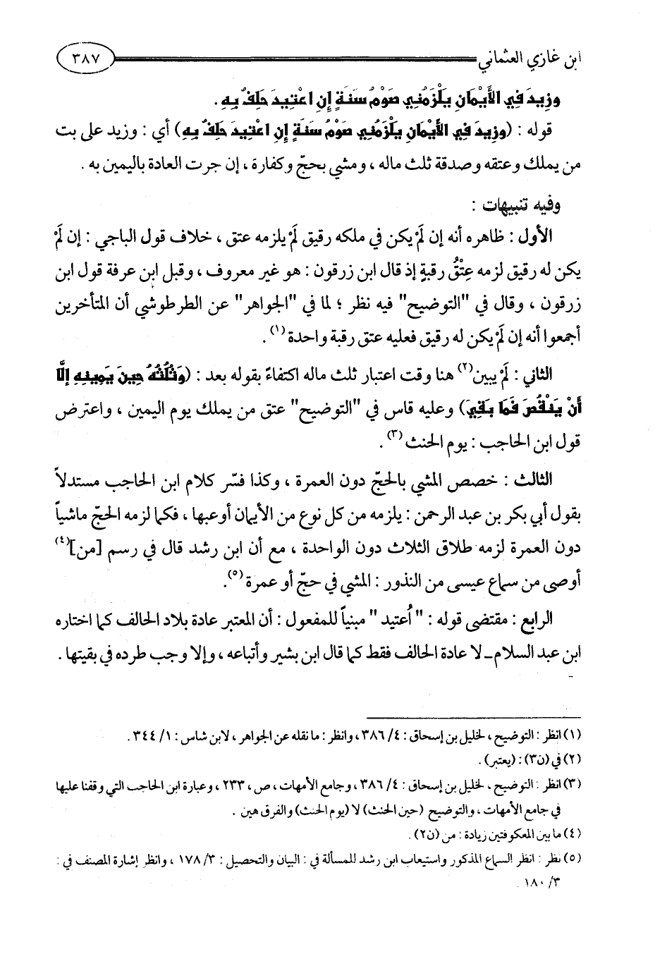 (¬3) انظر: التوضيح، لخليل بن إسحاق: 4/ 386، وجامع الأمهات، ص، 233، وعبارة ابن الحاجب التي وقفنا عليها في جامع الأمهات، والتوضيح (حين الحنث) لا (يوم الحنث) والفرق هين.