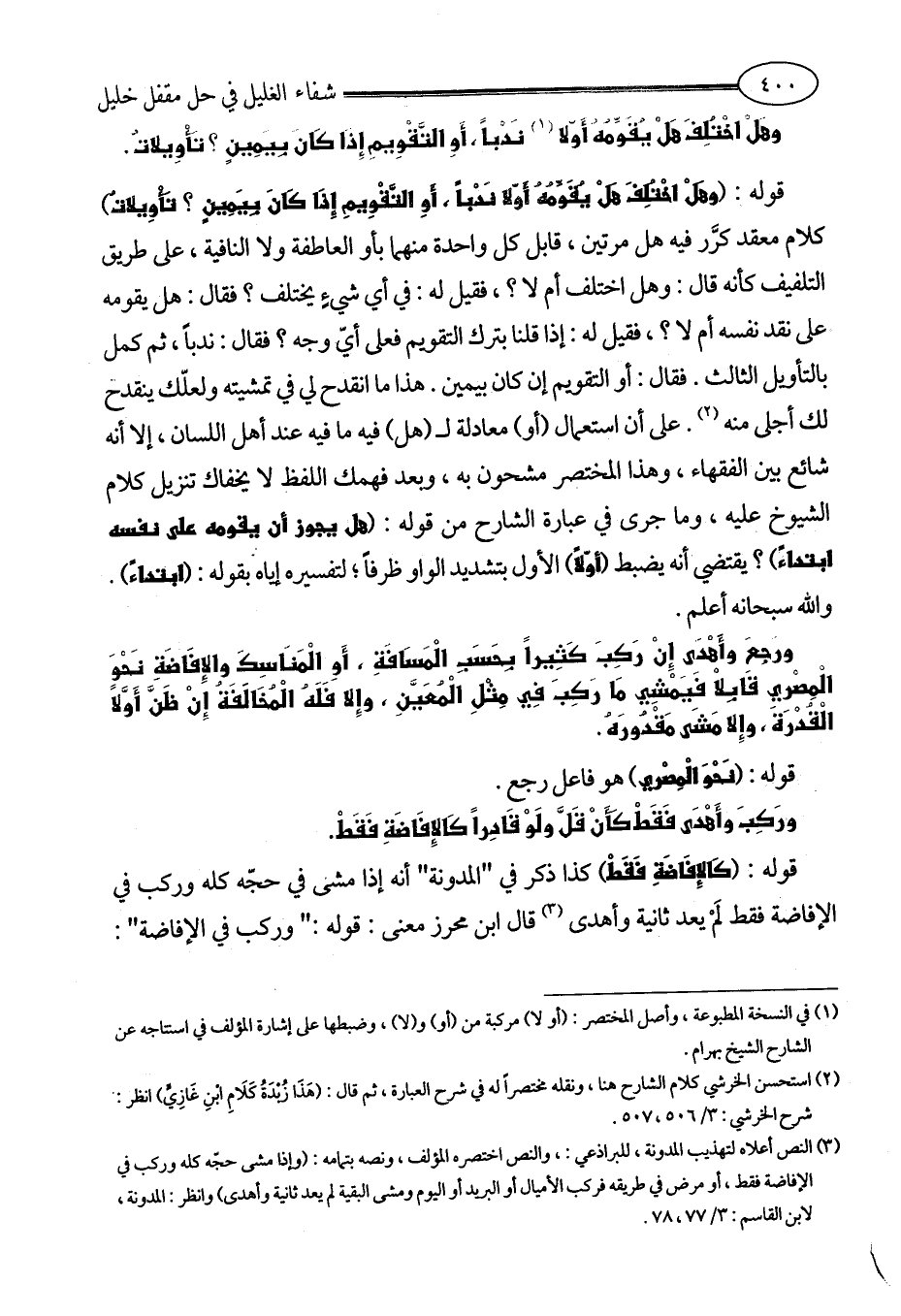 قوله: (وهَلْ اخْتُلِفَ هَلْ يُقَوِّمُهُ أَوّلا نَدْباً، أَوِ التَّقْوِيمِ إِذَا كَانَ بِيَمِينٍ؟ تَأْوِيلاتٌ) كلام معقد كرَّر فيه هل مرتين، قابل كل واحدة منهما بأو العاطفة ولا النافية، على طريق التلفيف كأنه قال: وهل اختلف أم لا؟، فقيل له: في أي شيءٍ يختلف؟ فقال: هل يقومه على نقد نفسه أم لا؟، فقيل له: إذا قلنا بترك التقويم فعلى أيّ وجه؟ فقال: ندباً، ثم كمل بالتأويل الثالث. فقال: أو التقويم إن كان بيمين. هذا ما انقدح لي في تمشيته ولعلّك ينقدح لك أجلى منه (¬2). على أن استعمال (أو) معادلة لـ (هل) فيه ما فيه عند أهل اللسان، إلا أنه شائع بين الفقهاء، وهذا المختصر مشحون به، وبعد فهمك اللفظ لا يخفاك تنزيل كلام الشيوخ عليه، وما جرى في عبارة الشارح من قوله: (هل يجوز أن يقومه على نفسه ابتداءً)؟ يقتضي أنه يضبط (أوّلاً) الأول بتشديد الواو ظرفاً؛ لتفسيره إياه بقوله: (ابتداءً). والله سبحانه أعلم.
