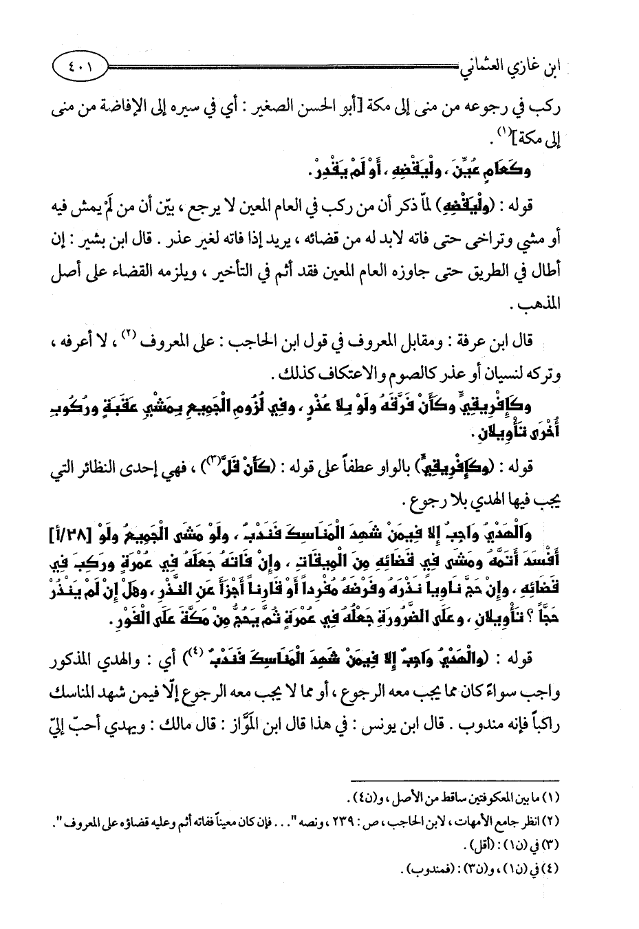 قوله: (والْهَدْيُ وَاجِبٌ إِلا فِيمَنْ شَهِدَ الْمَنَاسِكَ فَنَدْبٌ (¬4)) أي: والهدي المذكور واجب سواءً كان مما يجب معه الرجوع، أو مما لا يجب معه الرجوع إلّا فيمن شهد المناسك راكباً فإنه مندوب. قال ابن يونس: في هذا قال ابن المَوَّاز: قال مالك: ويهدي أحبّ إليّ