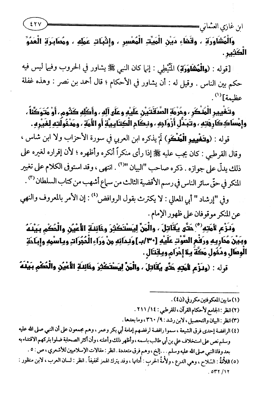 [قوله: (والْمُشَاوَرَةِ) المَتِّيْطِي: إنما كان النبي - صلى الله عليه وسلم - يشاور في الحروب وفيما ليس فيه حكم بين الناس. وقيل له: أن يشاور في الأحكام؛ قال أحمد بن نصر: وهذه غفلة عظيمة] (¬1).