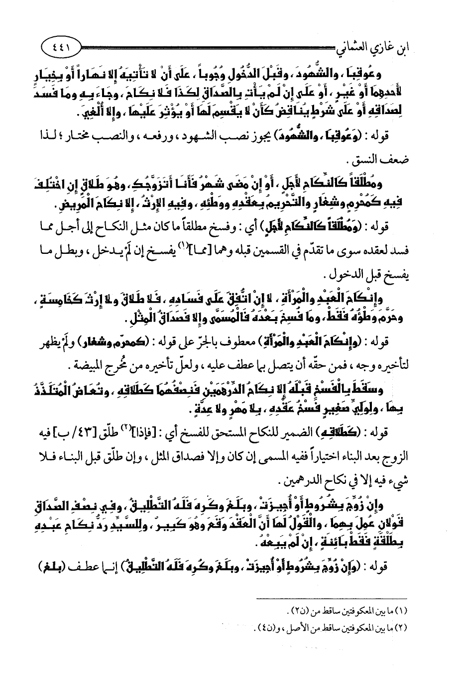 قوله: (وَمُطْلَقاً كَالنِّكَاحِ لأَجَلٍ) أي: وفسخ مطلقاً ما كان مثل النكاح إلى أجل مما فسد لعقده سوى ما تقدّم في القسمين قبله وهما [مما] (¬1) يفسخ إن لَمْ يدخل، وبطل ما يفسخ قبل الدخول.