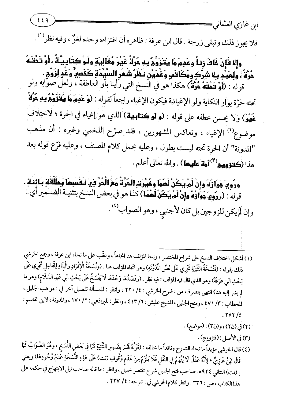 (¬4) قال الخرشي مؤيداً ما نحاه الشارح وناقداً ما خالفه: (قَوْلُهُ لَهُمَا بِضَمِيرِ التَّثْنِيَةِ كَمَا فِي بَعْضِ النُّسَخِ، وهُوَ الصَّوَابُ كَمَا قَالَ ابْنُ غَازِيٍّ؛ لِأَنَّهُ عَدْلٌ لَا يُتَّهَمُ فِي النَّقْلِ فَلَا يَلْزَمُ مِنْ عَدَمِ وُقُوفِ (تت) عَلَى هَذِهِ النُّسْخَةِ عَدَمُ وُجُودِهَا) ويعني بـ (تت) التتائي 924هـ صاحب فتح الجليل شرح مختصر خليل، وانظر: ما قاله صاحب نيل الابتهاج في حكمه على هذا الكتاب، ص: 336. وانظر كلام الخرشي في: شرحه: 4/ 227.