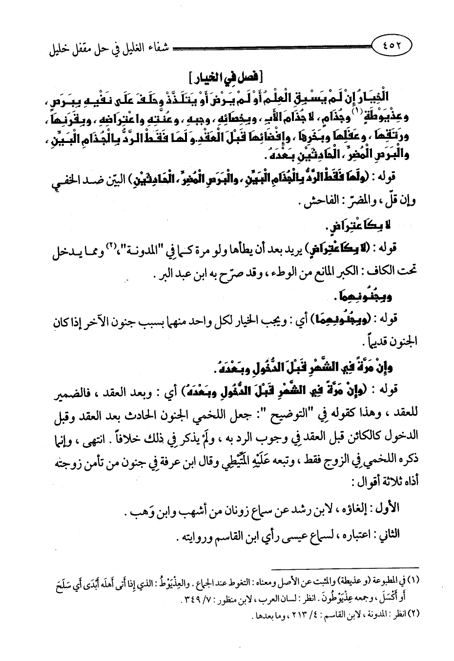 قوله: (ولَهَا فَقَطْ الرَّدُّ بِالْجُذَامِ الْبَيِّنِ، والْبَرَصِ الْمُضِرِّ، الْحَادِثَيْنِ) البيّن ضد الخفي وإن قلّ، والمضرّ: الفاحش.