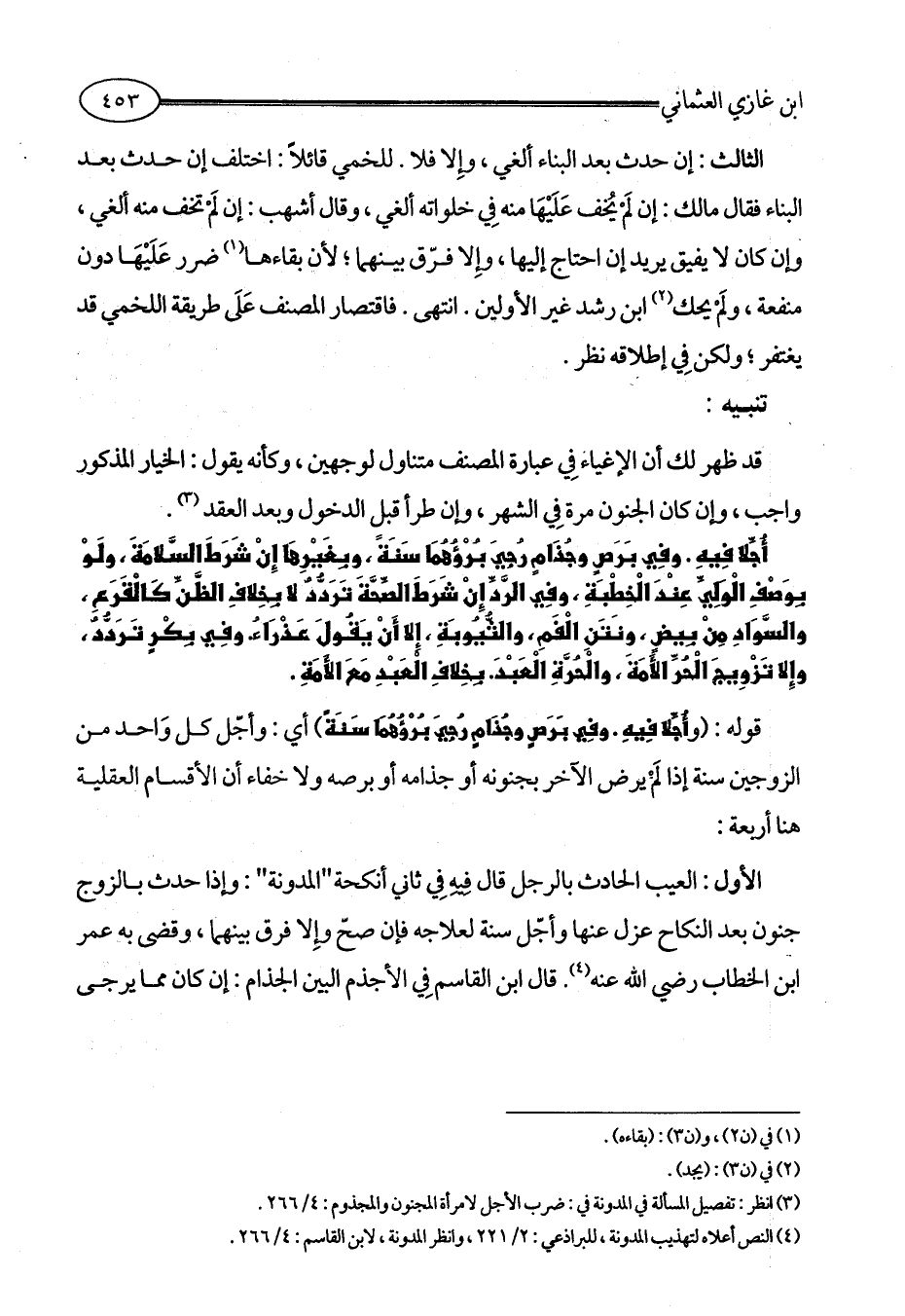 (¬3) انظر: تفصيل المسألة في المدونة في: ضرب الأجل لامرأة المجنون والمجذوم: 4/ 266.