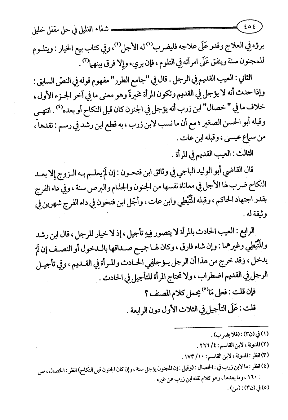 (¬4) انظر: ما لابن زرب في: الخصال: (وقيل: إن المجنون يؤجل سنة، وإن كان الجنون قبل النكاح) انظر: الخصال، ص: 160، وما بعدها، وهو كلام نقله ابن زرب عن غيره.