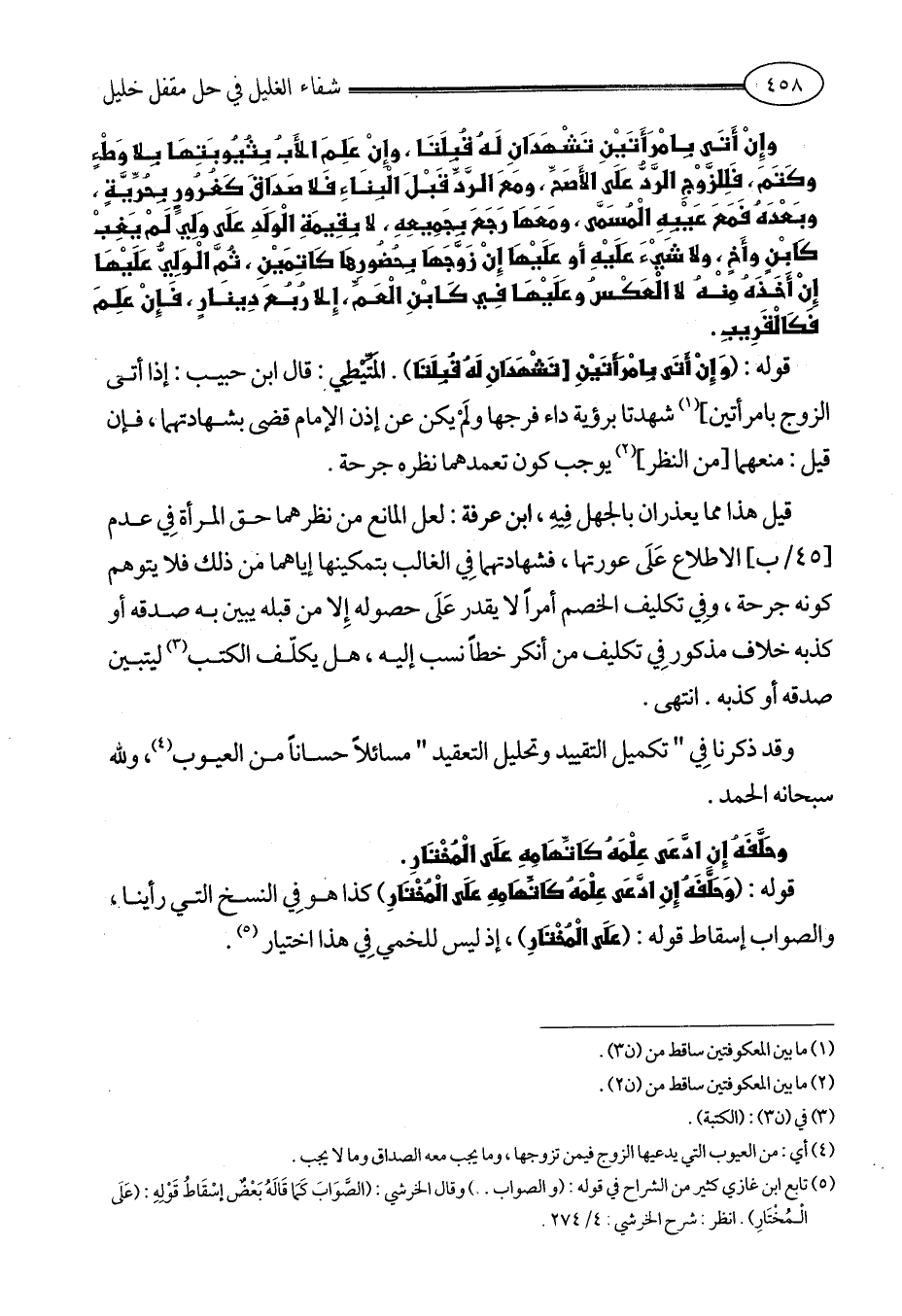 (¬5) تابع ابن غازي كثير من الشراح في قوله: (والصواب. .) وقال الخرشي: (الصَّوَابَ كَمَا قَالَهُ بَعْضٌ إسْقَاطُ قَوْلِهِ: (عَلَى الْمُخْتَارِ). انظر: شرح الخرشي: 4/ 274.