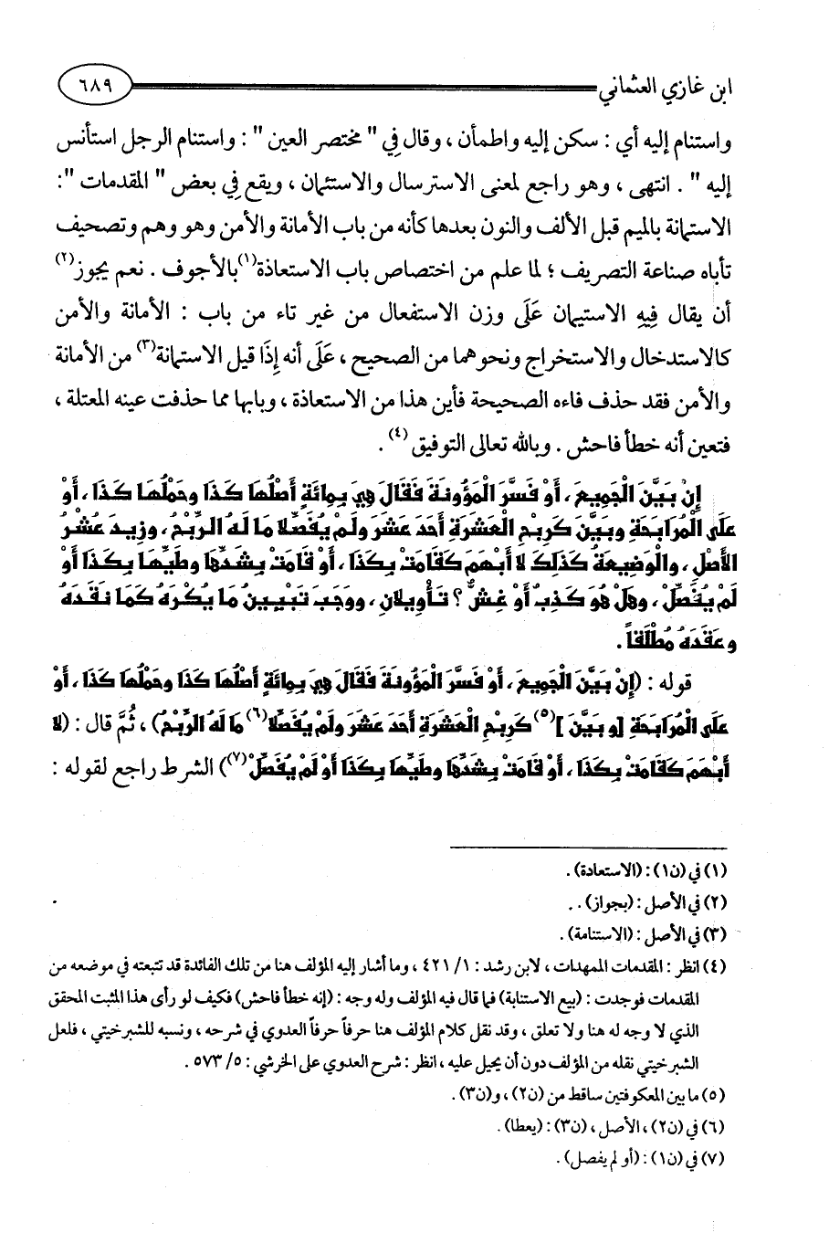 (¬4) انظر: المقدمات الممهدات، لابن رشد: 1/ 421، وما أشار إليه المؤلف هنا من تلك الفائدة قد تتبعته في موضعه من المقدمات فوجدت: (بيع الاستنابة) فما قال فيه المؤلف وله وجه: (إنه خطأ فاحش) فكيف لو رأى هذا المثبت المحقق الذي لا وجه له هنا ولا تعلق، وقد نقل كلام المؤلف هنا حرفاً حرفاً العدوي في شرحه، ونسبه للشبرخيتي، فلعل الشبرخيتي نقله من المؤلف دون أن يحيل عليه، انظر: شرح العدوي على الخرشي: 5/ 573.