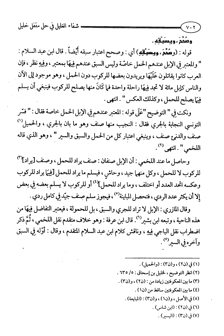 وقال المازري: الإبل لا تراد للجري والسبق، بل للحمولة، فيعتبر التفاضل فِيهَا من هذه الناحية، وتبعه ابن بشير (¬6). قال ابن عرفة: وهو خلاف متقدم نقل اللخمي، ثُمَّ ذكر اضطراب نقل الباجي فِيهِ، وناقش كلام ابن عبد السلام المتقدم، وقال: أوّله فِي السبق وآخره فِي السير (¬7).