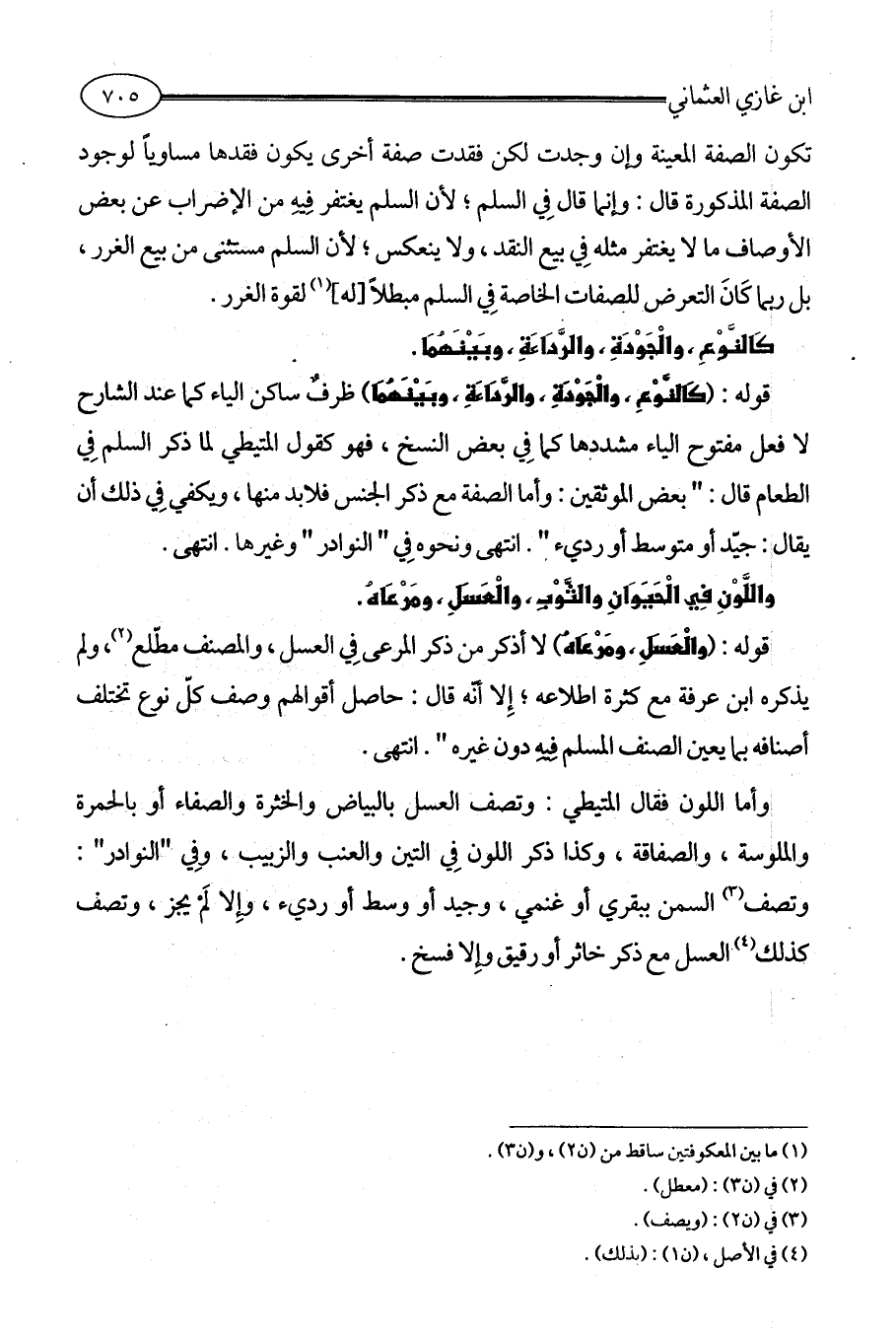 وأما اللون فقال المتيطي: وتصف العسل بالبياض والخثرة والصفاء أو بالحمرة والملوسة، والصفاقة، وكذا ذكر اللون فِي التين والعنب والزبيب، وفِي " النوادر ": وتصف (¬3) السمن ببقري أو غنمي، وجيد أو وسط أو رديء، وإِلا لَمْ يجز، وتصف كذلك (¬4) العسل مع ذكر خاثر أو رقيق وإِلا فسخ.