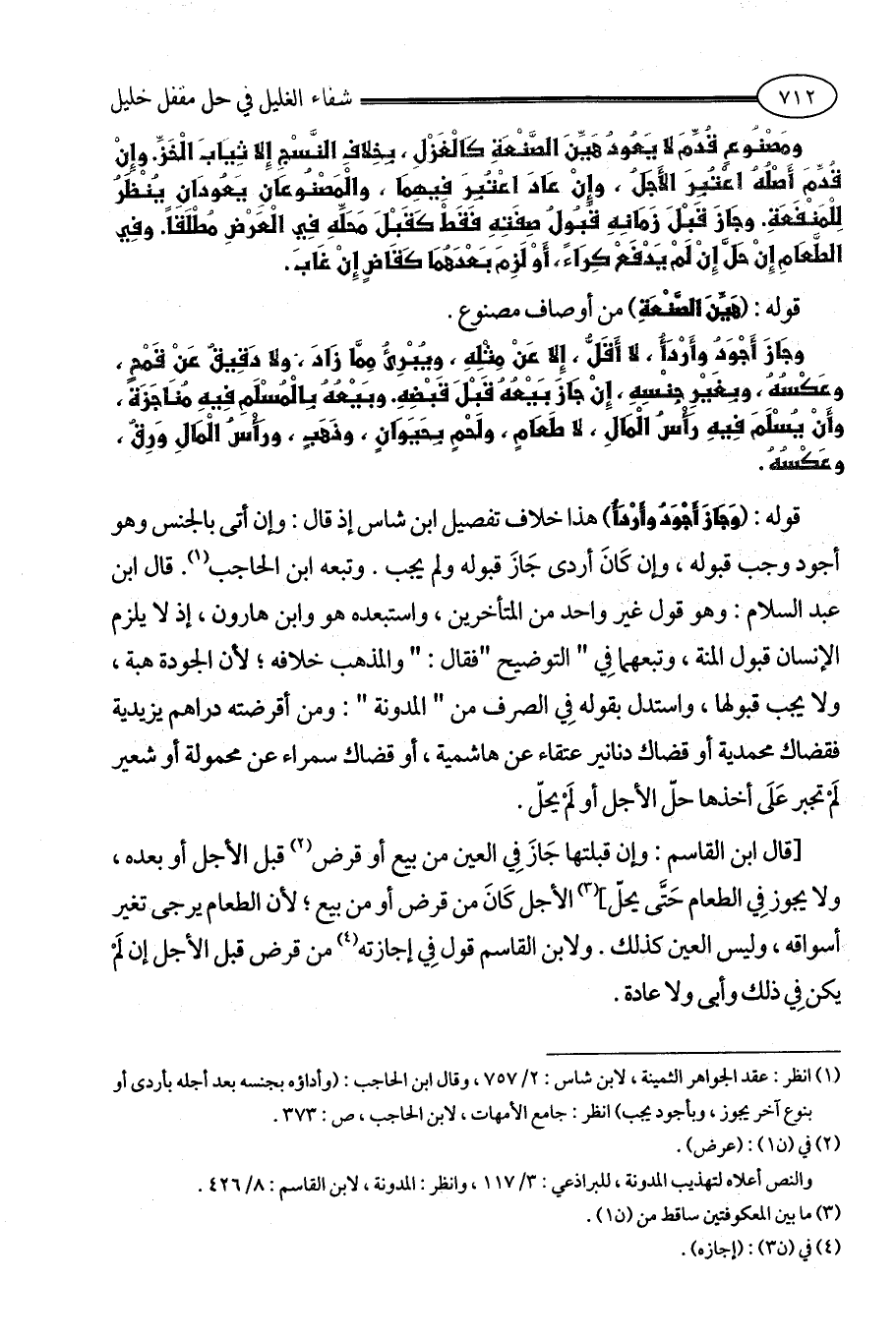 ومَصْنُوعٍ قُدِّمَ لا يَعُودُ هَيِّنَ الصَّنْعَةِ كَالْغَزْلِ، بِخِلافِ النَّسْجِ إِلا ثِيَابَ الْخَزِّ. وإِنْ قُدِّمَ أَصْلُهُ اعْتُبِرَ الأَجَلُ، وإِنْ عَادَ اعْتُبِرَ فِيهِمَا، والْمَصْنُوعَانِ يَعُودَانِ يُنْظَرُ لِلْمَنْفَعَةِ. وجَازَ قَبْلَ زَمَانِهِ قُبُولُ صِفَتِهِ فَقَطْ كَقَبْلَ مَحَلِّهِ فِي الْعَرْضِ مُطْلَقاً. وفِي الطَّعَامِ إِنْ حَلَّ إِنْ لَمْ يَدْفَعْ كِرَاءً، أَوْ لَزِمَ بَعْدَهُمَا كَقَاضٍ إِنْ غَابَ.