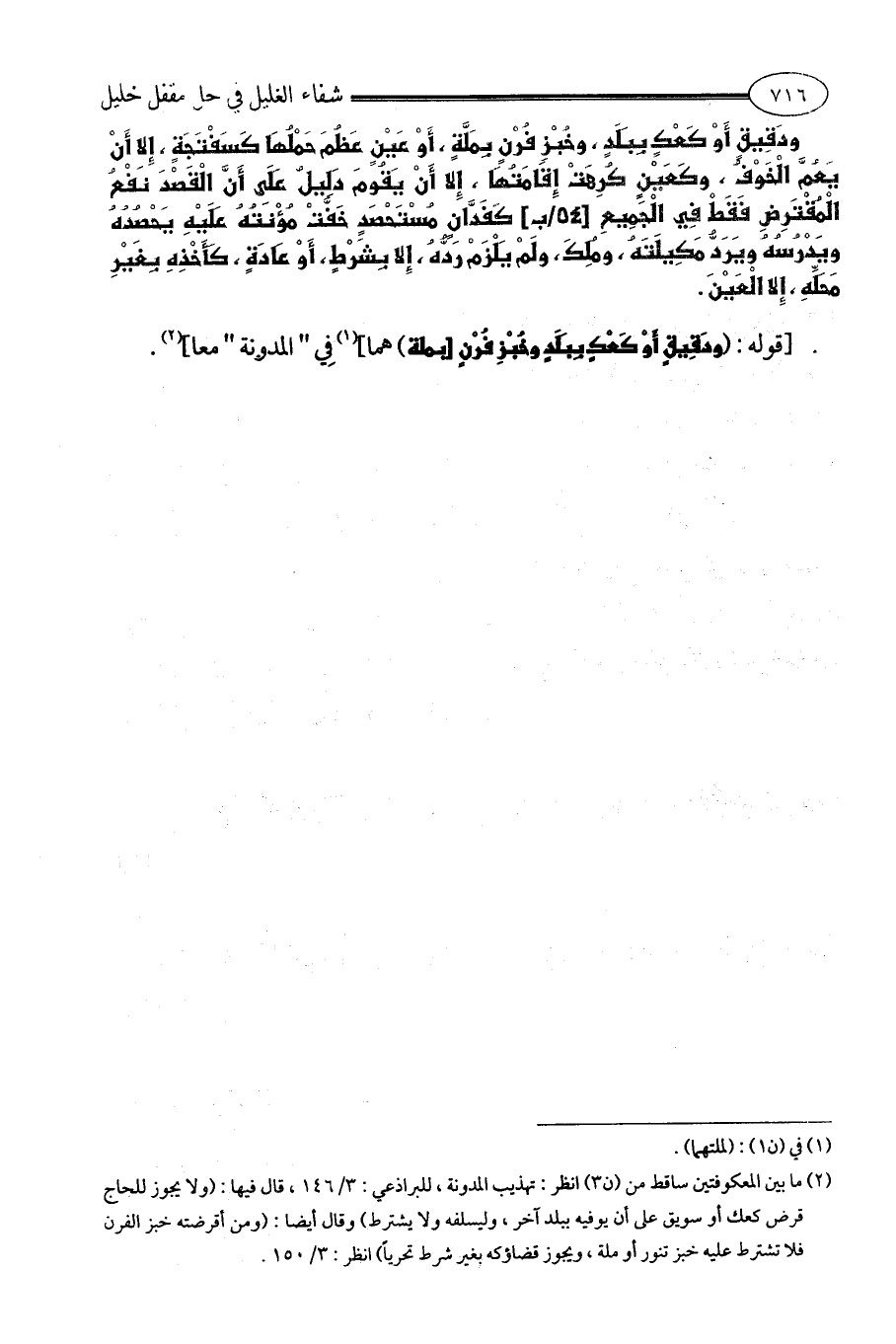 (¬2) ما بين المعكوفتين ساقط من (ن 3) انظر: تهذيب المدونة، للبراذعي: 3/ 146، قال فيها: (ولا يجوز للحاج قرض كعك أو سويق على أن يوفيه ببلد آخر، وليسلفه ولا يشترط) وقال أيضا: (ومن أقرضته خبز الفرن فلا تشترط عليه خبز تنور أو ملة، ويجوز قضاؤكه بغير شرط تحرياً) انظر: 3/ 150.