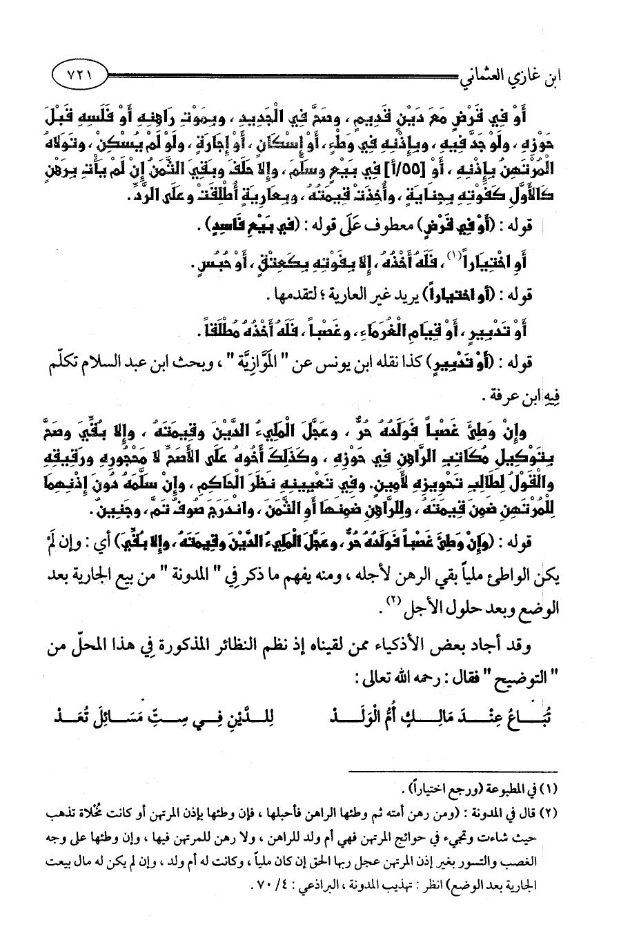 (¬2) قال في المدونة: (ومن رهن أمته ثم وطئها الراهن فأحبلها، فإن وطئها بإذن المرتهن أو كانت مُخْلاة تذهب حيث شاءت وتجيء في حوائج المرتهن فهي أم ولد للراهن، ولا رهن للمرتهن فيها، وإن وطئها على وجه الغصب والتسور بغير إذن المرتهن عجل ربها الحق إن كان ملياً، وكانت له أم ولد، وإن لم يكن له مال بيعت الجارية بعد الوضع) انظر: تهذيب المدونة، البراذعي: 4/ 70.
