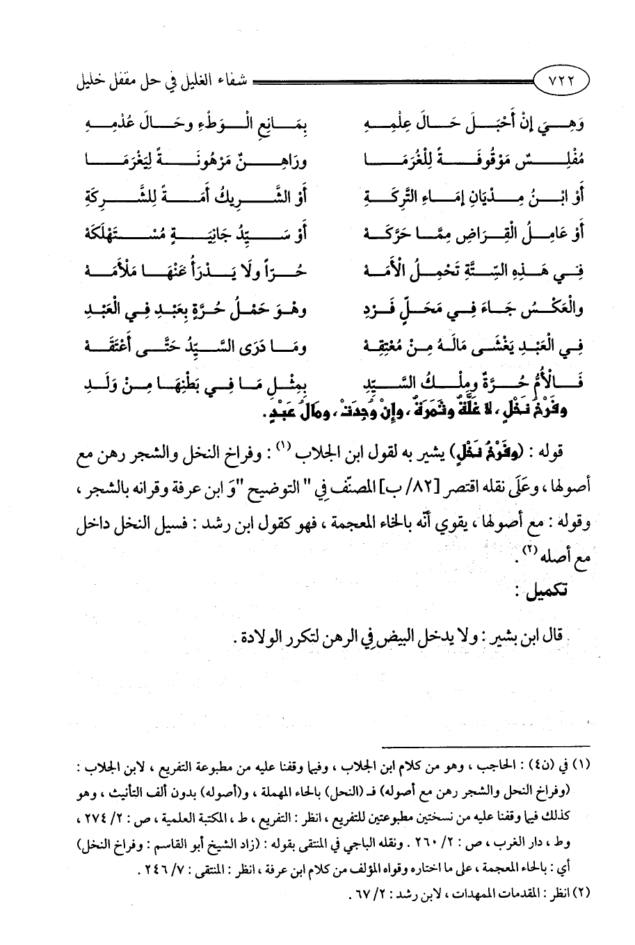 (¬1) في (ن 4): الحاجب، وهو من كلام ابن الجلاب، وفيما وقفنا عليه من مطبوعة التفريع، لابن الجلاب: (وفراخ النحل والشجر رهن مع أصوله) فـ (النحل) بالحاء المهملة، و (أصوله) بدون ألف التأنيث، وهو كذلك فيما وقفنا عليه من نسختين مطبوعتين للتفريع، انظر: التفريع، ط، المكتبة العلمية، ص: 2/ 274، وط، دار الغرب، ص: 2/ 260. ونقله الباجي في المنتقى بقوله: (زاد الشيخ أبو القاسم: وفراخ النخل) أي: بالحاء المعجمة، على ما اختاره وقواه المؤلف من كلام ابن عرفة، انظر: المنتقى: 7/ 246.