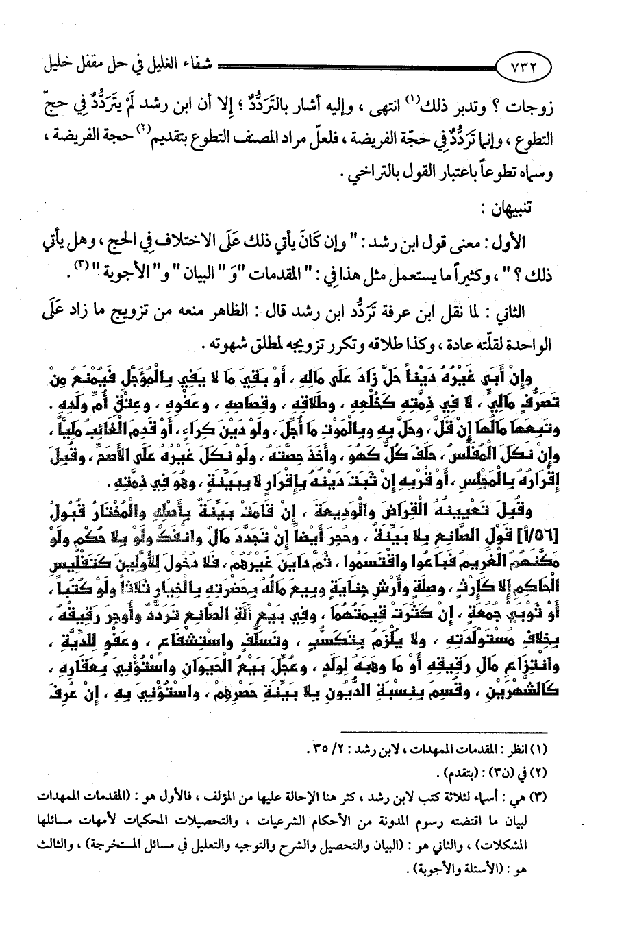 (¬3) هي: أسماء لثلاثة كتب لابن رشد، كثر هنا الإحالة عليها من المؤلف، فالأول هو: (المقدمات الممهدات لبيان ما اقتضته رسوم المدونة من الأحكام الشرعيات، والتحصيلات المحكمات لأمهات مسائلها المشكلات)، والثاني هو: (البيان والتحصيل والشرح والتوجيه والتعليل في مسائل المستخرجة)، والثالث هو: (الأسئلة والأجوبة).