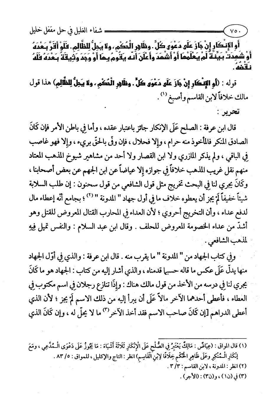 (¬1) قال المواق: (عِيَاضٌ: مَالِكٌ يَعْتَبِرُ فِي الصُّلْحِ عَلَى الْإِنْكَارِ ثَلَاثَةَ أَشْيَاءَ: مَا يَجُوزُ عَلَى دَعْوَى الْمُدَّعِي، ومَعَ إنْكَارِ الْمُنْكِرِ وعَلَى ظَاهِرِ الْحُكْمِ خِلَافًا لِابْنِ الْقَاسِمِ) انظر: التاج والإكليل، للمواق: 5/ 83.
