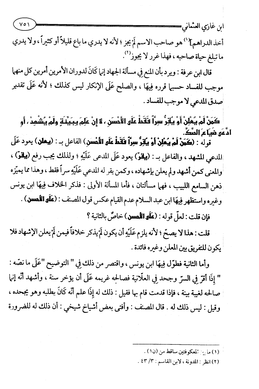 قال ابن عرفة: ويرد بأن المنع فِي مسألة الجهاد إنما كَانَ لدوران الأمرين أمرين كل منهما موجب للفساد حسبما قرره فِيهَا، والصلح عَلَى الإنكار ليس كذلك؛ لأنه عَلَى تقدير صدق المدعي لا موجب للفساد.