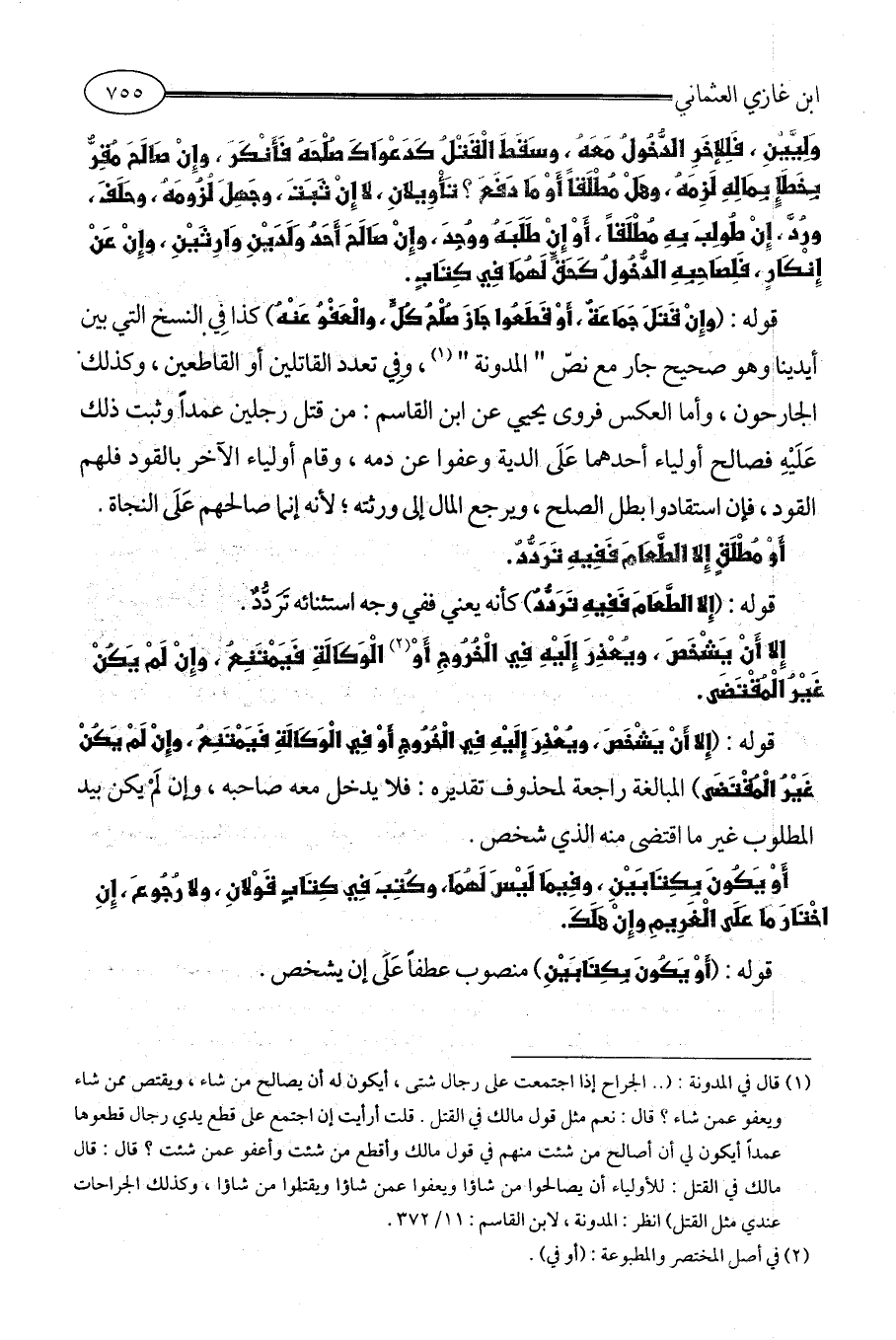 قوله: (وَإِنْ قَتَلَ جَمَاعَةٌ، أَوْ قَطَعُوا جَازَ صُلْحُ كُلٍّ، والْعَفْوُ عَنْهُ) كذا فِي النسخ التي بين أيدينا وهو صحيح جار مع نصّ " المدونة " (¬1)، وفِي تعدد القاتلين أو القاطعين، وكذلك الجارحون، وأما العكس فروى يحيي عن ابن القاسم: من قتل رجلين عمداً وثبت ذلك عَلَيْهِ فصالح أولياء أحدهما عَلَى الدية وعفوا عن دمه، وقام أولياء الآخر بالقود فلهم القود، فإن استقادوا بطل الصلح، ويرجع المال إلى ورثته؛ لأنه إنما صالحهم عَلَى النجاة.
