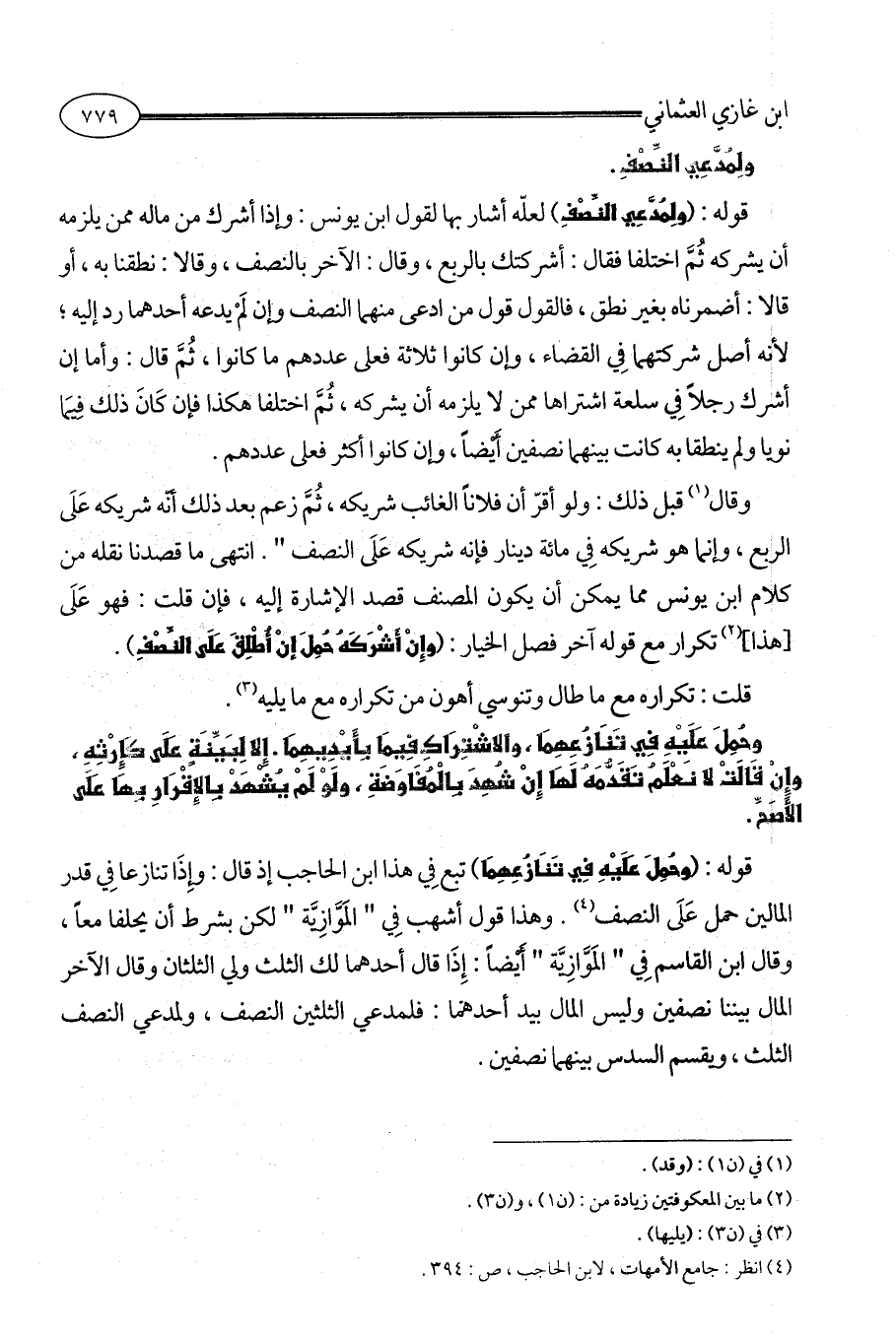 قوله: (وحُمِلَ عَلَيْهِ فِي تَنَازُعِهِمَا) تبع فِي هذا ابن الحاجب إذ قال: وإِذَا تنازعا فِي قدر المالين حمل عَلَى النصف (¬4). وهذا قول أشهب فِي " المَوَّازِيَّة " لكن بشرط أن يحلفا معاً، وقال ابن القاسم فِي " المَوَّازِيَّة " أَيْضاً: إِذَا قال أحدهما لك الثلث ولي الثلثان وقال الآخر المال بيننا نصفين وليس المال بيد أحدهما: فلمدعي الثلثين النصف، ولمدعي النصف الثلث، ويقسم السدس بينهما نصفين.