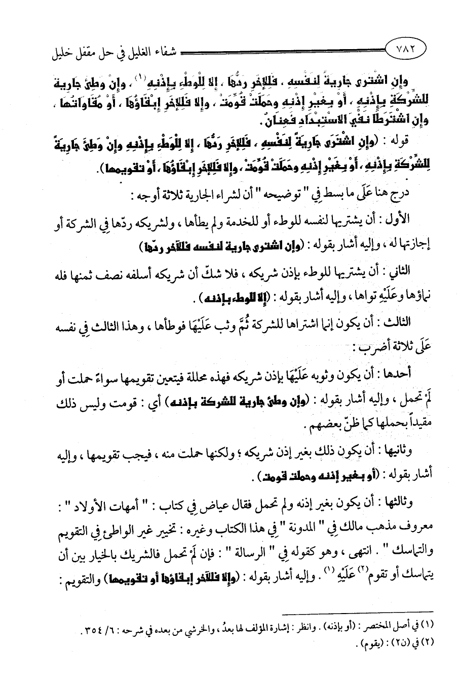 وثالثها: أن يكون بغير إذنه ولم تحمل فقال عياض فِي كتاب: " أمهات الأولاد ": معروف مذهب مالك فِي " المدونة " فِي هذا الكتاب وغيره: تخيير غير الواطئ فِي التقويم والتماسك ". انتهى، وهو كقوله فِي " الرسالة ": فإن لَمْ تحمل فالشريك بالخيار بين أن يتماسك أو تقوم (¬2) عَلَيْهِ (¬3). وإليه أشار بقوله: (وإِلا فللآخر إبقاؤها أو تقويمها) والتقويم: