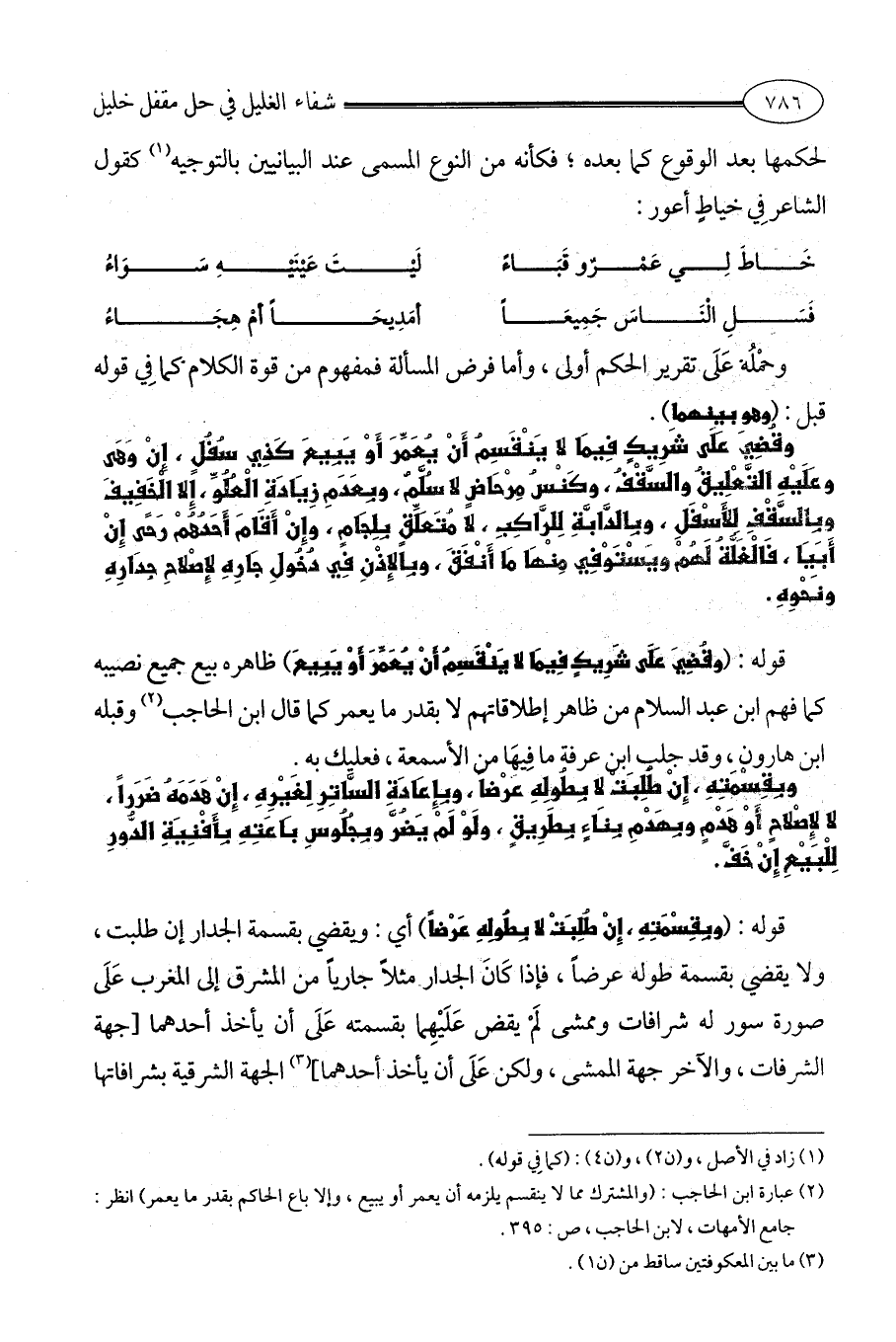 (¬2) عبارة ابن الحاجب: (والمشترك مما لا ينقسم يلزمه أن يعمر أو يبيع، وإلا باع الحاكم بقدر ما يعمر) انظر: جامع الأمهات، لابن الحاجب، ص: 395.
