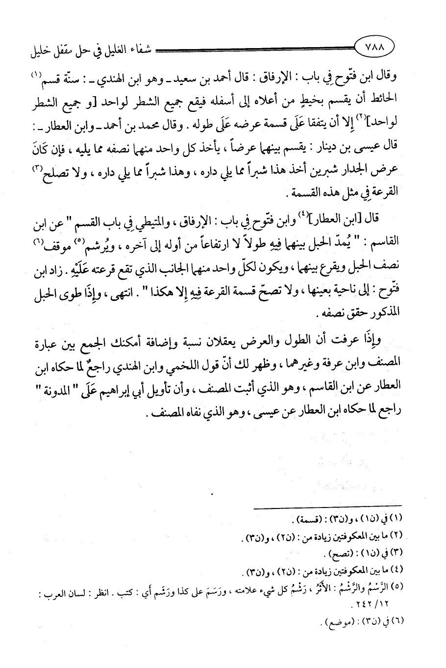 وإِذَا عرفت أن الطول والعرض يعقلان نسبة وإضافة أمكنك الجمع بين عبارة المصنف وابن عرفة وغيرهما، وظهر لك أنّ قول اللخمي وابن الهندي راجعٌ لما حكاه ابن العطار عن ابن القاسم، وهو الذي أثبت المصنف، وأن تأويل أبي إبراهيم عَلَى " المدونة " راجع لما حكاه ابن العطار عن عيسى، وهو الذي نفاه المصنف.