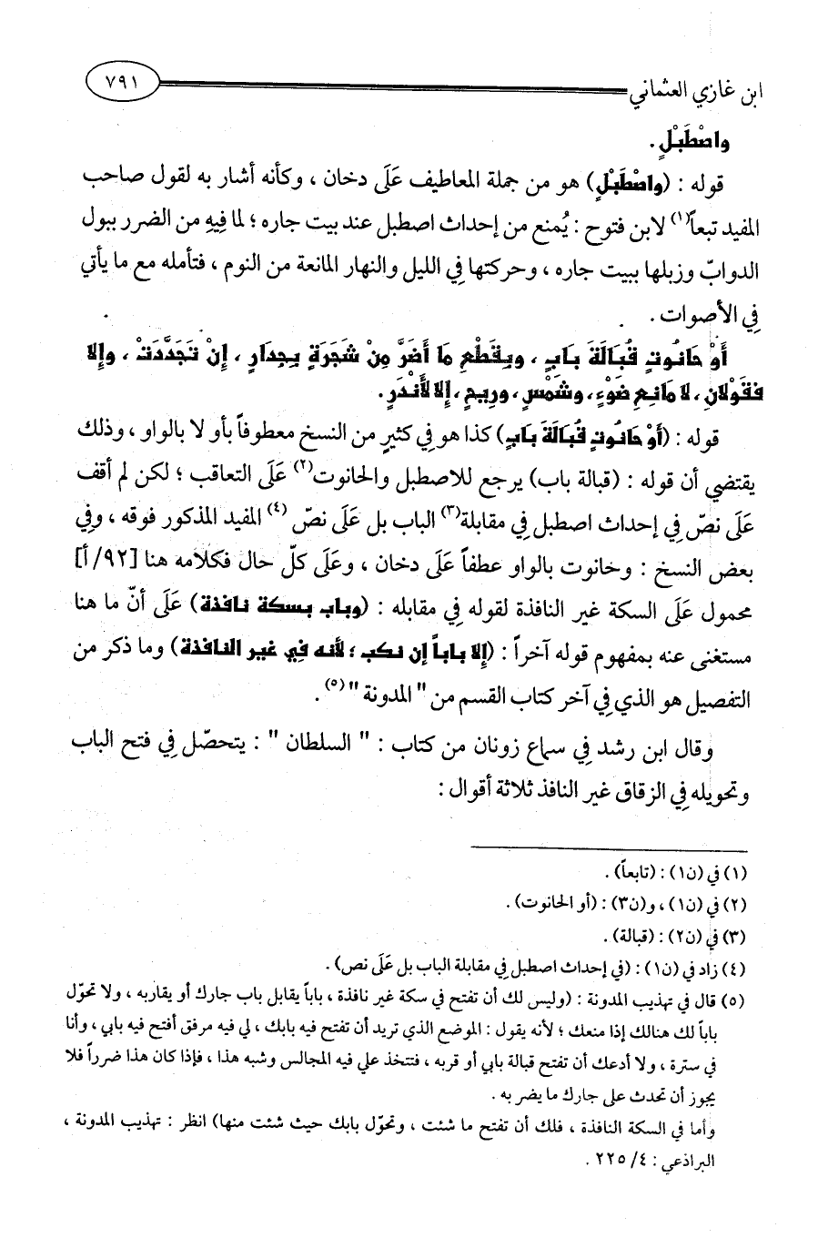 قوله: (أَوْ حَانُوتٍ قُبَالَةَ بَابٍ) كذا هو فِي كثيرٍ من النسخ معطوفاً بأو لا بالواو، وذلك يقتضي أن قوله: (قبالة باب) يرجع للاصطبل والحانوت (¬2) عَلَى التعاقب؛ لكن لم أقف عَلَى نصّ فِي إحداث اصطبل فِي مقابلة (¬3) الباب بل عَلَى نصّ (¬4) المفيد المذكور فوقه، وفِي بعض النسخ: وحانوت بالواو عطفاً عَلَى دخان، وعَلَى كلّ حال فكلامه هنا [92 / أ] محمول عَلَى السكة غير النافذة لقوله فِي مقابله: (وباب بسكة نافذة) عَلَى أنّ ما هنا مستغنى عنه بمفهوم قوله آخراً: (إِلا باباً إن نكب؛ لأنه فِي غير النافذة) وما ذكر من التفصيل هو الذي فِي آخر كتاب القسم من " المدونة " (¬5).