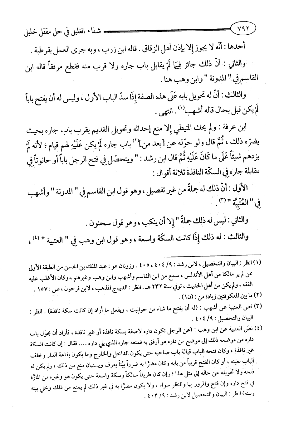 (¬4) نصّ العتبية عن ابن وهب: (عن الرجل تكون داره لاصقة بسكة نافذة أو غير نافذة، فأراد أن يحوّل باب داره من موضعه ذلك إلى موضع من داره هو أرفق به فمنعه جاره الذي يلي داره .... فقال: إن كانت السكة غير نافذة، وكان فتحه الباب قبالة باب صاحبه حتى يكون الداخل والخارج وما يكون بقاعة الدار وخلف الباب بعينه، أو كان الفتح قريباً من بابه وكان مضرًّا به ضرراً بيِّناً يعرف ويستبان منع من ذلك، ولم يكن له فتحه ولا تحويله عن حاله إلى مثل هذا؛ وإن كان طريقاً سالكاً وسكة واسعة حتى يكون هو وغيره من المارَّة في فتح داره وإن فتح والمرور بها والنظر سواء، ولا يكون مضرًّا به في غير ذلك لم يمنع من ذلك وخلي بينه وبينه) انظر: البيان والتحصيل لابن رشد: 9/ 403.