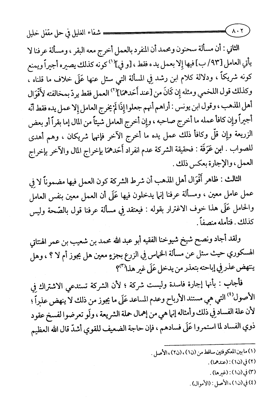 ولقد أجاد ونصح شيخ شيوخنا الفقيه أبو عبد الله محمد بن شعيب بن عمر الهنتاتي الهسكوري حيث سئل عن مسألة الخماس فِي الزرع بجزءٍ معين هل يجوز أم لا؟، وهل ينتهض عذر فِي إباحته بتعذر من يدخل عَلَى غير هذا (¬3)؟