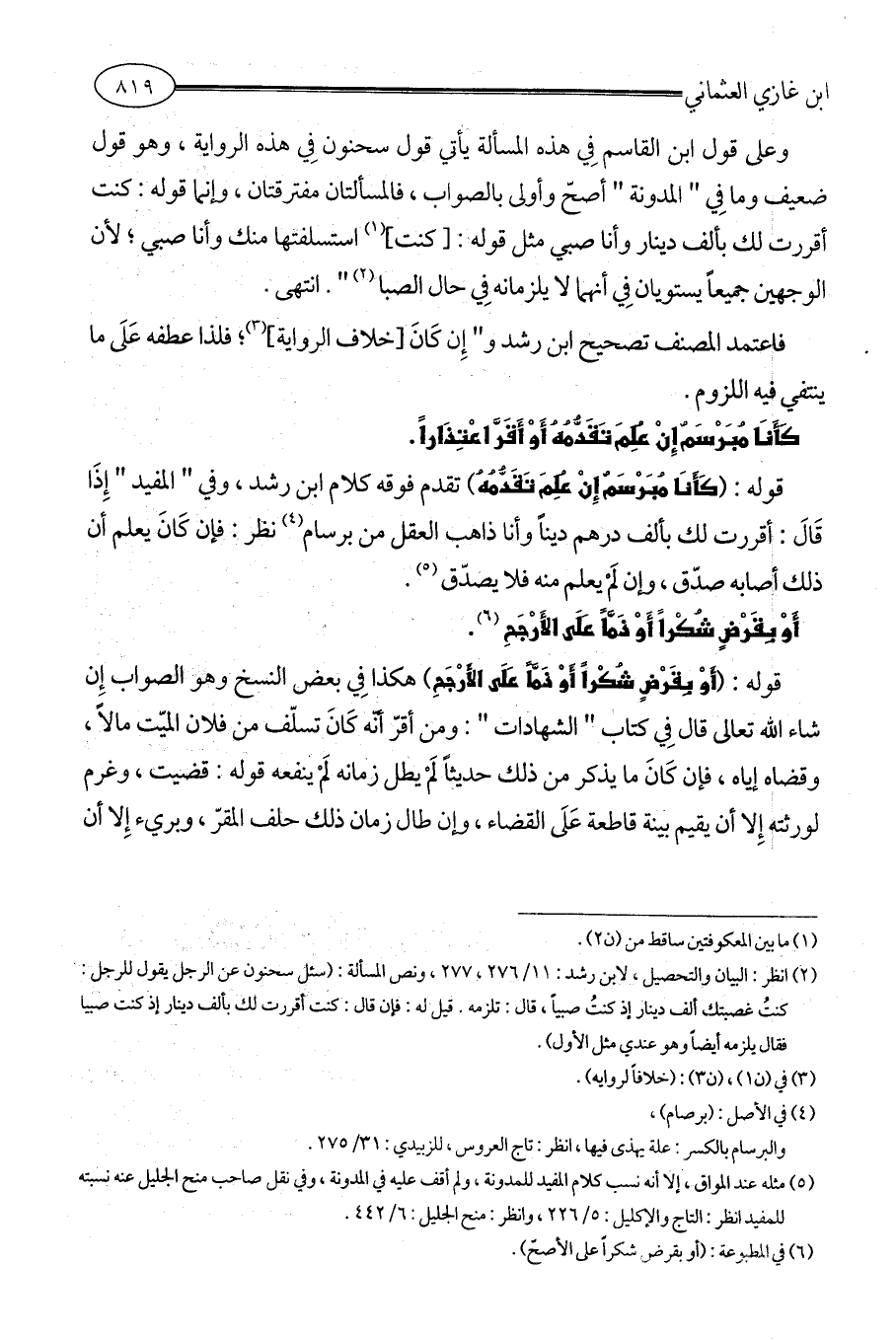 (¬2) انظر: البيان والتحصيل، لابن رشد: 11/ 276، 277، ونص المسألة: (سئل سحنون عن الرجل يقول للرجل: كنتُ غصبتك ألف دينار إذ كنتُ صبياً، قال: تلزمه. قيل له: فإن قال: كنت أقررت لك بألف دينار إذ كنت صبيا فقال يلزمه أيضاً وهو عندي مثل الأول).