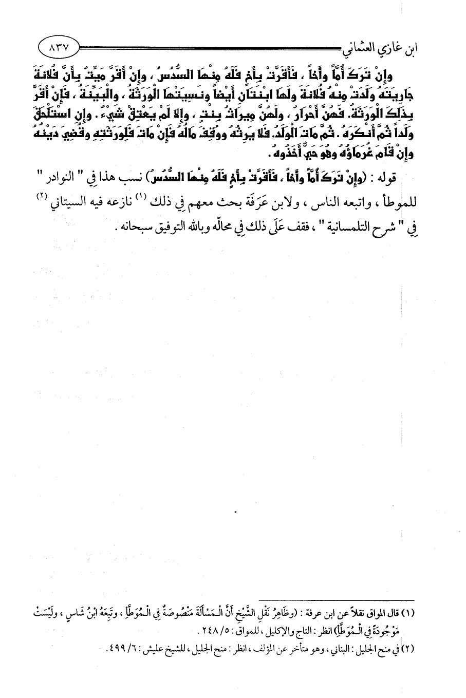 قوله: (وَإِنْ تَرَكَ أُمَّاً وأَخاً، فَأَقَرَّتْ بِأَخٍ فَلَهُ مِنْهَا السُّدُسُ) نسب هذا فِي " النوادر " للموطأ، واتبعه الناس، ولابن عَرَفَة بحث معهم فِي ذلك (¬1) نازعه فيه السيتاني (¬2) فِي " شرح التلمسانية "، فقف عَلَى ذلك فِي محالّه وبالله التوفيق سبحانه.