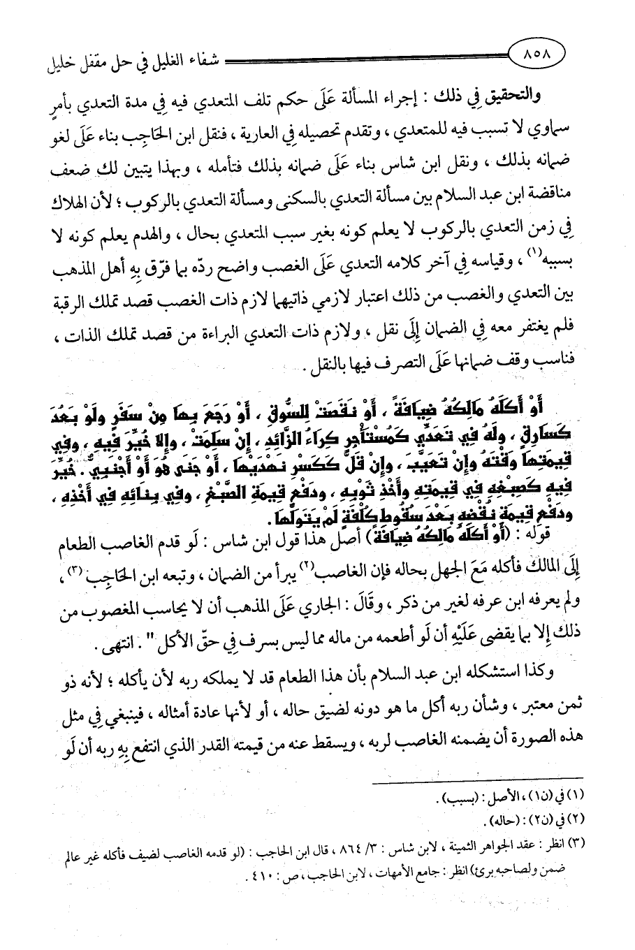 (¬3) انظر: عقد الجواهر الثمينة، لابن شاس: 3/ 864، قال ابن الحاجب: (لو قدمه الغاصب لضيف فأكله غير عالم ضمن ولصاحبه برئ) انظر: جامع الأمهات، لابن الحاجب، ص: 410.