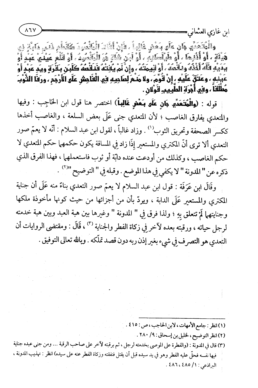 وقَالَ ابن عَرَفَة: قول ابن عبد السلام لا يعمّ صور التعدي بناءً منه عَلَى أن جناية المكتري والمستعير عَلَى الدابة، ويردّ بأن من أجزائها من حيث كونها مأخوذة ملكها وجنايتهما لَمْ تتعلق بِهِ؛ ولذا فرق فِي " المدونة " وغيرها بين هبة العبد وبين هبة خدمته لرجل حياته، ورقبته بعده لآخر فِي زكاة الفطر والجناية (¬3)، قَالَ: ومقتضى الروايات أن التعدي هو التصرف فِي شيء بغير إذن ربه دون قصد تملّكه. وبالله تعالى التوفيق.