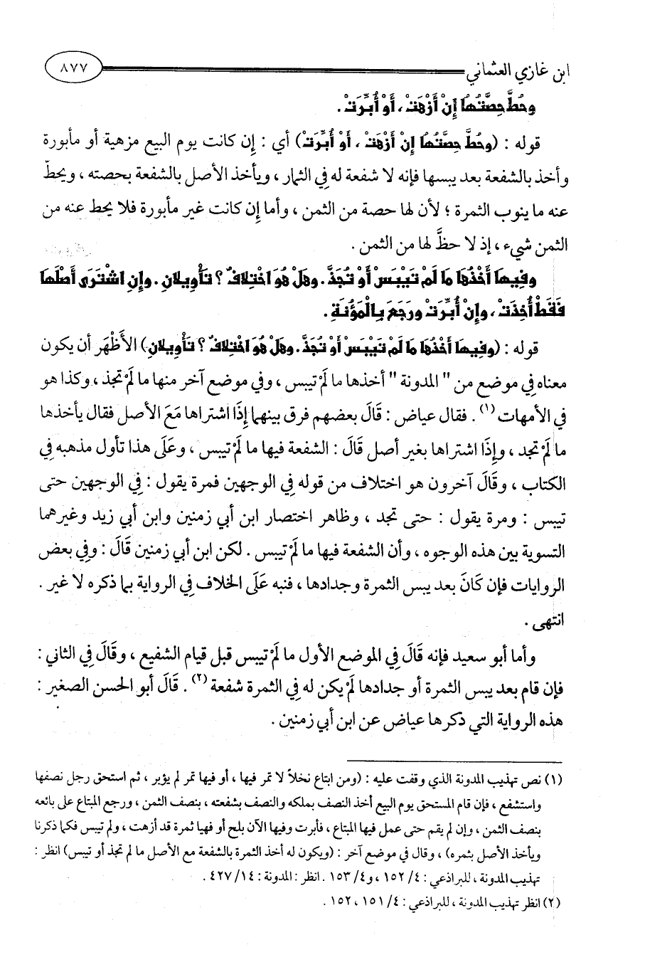 (¬1) نص تهذيب المدونة الذي وقفت عليه: (ومن ابتاع نخلاً لا تمر فيها، أو فيها تمر لم يؤبر، ثم استحق رجل نصفها واستشفع، فإن قام المستحق يوم البيع أخذ النصف بملكه والنصف بشفعته، بنصف الثمن، ورجع المبتاع على بائعه بنصف الثمن، وإن لم يقم حتى عمل فيها المبتاع، فأبرت وفيها الآن بلح أو فهيا ثمرة قد أزهت، ولم تيبس فكما ذكرنا ويأخذ الأصل بثمره)، وقال في موضع آخر: (ويكون له أخذ الثمرة بالشفعة مع الأصل ما لم تجذ أو تيبس) انظر: تهذيب المدونة، للبراذعي: 4/ 152، و4/ 153. انظر: المدونة: 14/ 427.