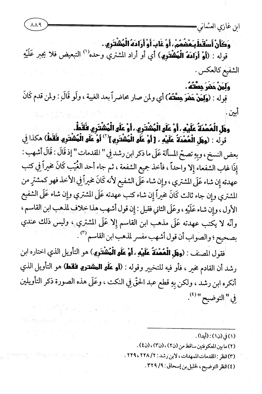 قوله: (وَهَلِ الْعُهْدَةُ عَلَيْهِ، [أَوْ عَلَى الْمُشْتَرِي] (¬2) أَوْ عَلَى الْمُشْتَرِي فَقَطْ) هكذا فِي بعض النسخ، وبِهِ تصحّ المسألة عَلَى ما ذكر ابن رشد فِي " المقدمات " إذ قَالَ: قَالَ أشهب: إِذَا غاب الشفعاء إِلا واحداً، فأخذ جميع الشفعة، ثم جاء أحد الغُيّب كَانَ مخيراً فِي كتب عهدته إِن شاء عَلَى المشتري، وإِن شاء عَلَى الشفيع لأنه كَانَ مخيراً فِي الأخذ فهو كمشترٍ من المشتري وإِن جاء ثالث كَانَ مخيراً إِن شاء كتب عهدته عَلَى المشتري وإِن شاء عَلَى الشفيع الأول، وإِن شاء عَلَيْهِ، وعَلَى الثاني فقيل: إِن قول أشهب هذا خلاف لمذهب ابن القاسم، وأنّه لا يكتب عهدته عَلَى مذهب ابن القاسم إِلا عَلَى المشتري، وليس ذلك عندي بصحيح؛ والصواب أن قول أشهب مفسر لمذهب ابن القاسم (¬3).