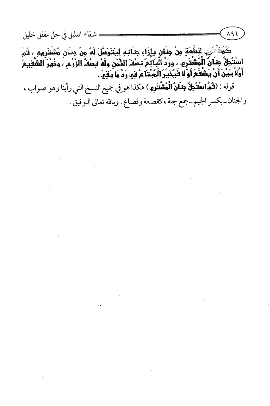 قوله: (ثُمَّ اسْتُحِقَّ جِنَانُ الْمُشْتَرِي) هكذا هو فِي جميع النسخ التي رأينا وهو صواب، والجنان - بكسر الجيم - جمع جنة، كقصعة وقصاع. وبالله تعالى التوفيق.