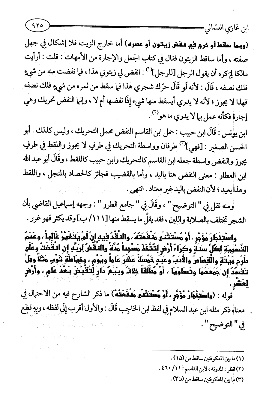ابن يونس: قَالَ ابن حبيب: حمل ابن القاسم النفض محمل التحريك، وليس كذلك. أبو الحسن الصغير: [فهي] (¬3) طرفان وواسطة التحريك فِي طرفٍ لا يجوز واللقط فِي طرفٍ يجوز والنفض واسطة جعله ابن القاسم كالتحريك وابن حبيب كاللقط، وقَالَ أبو عبد الله ابن العطار: معنى النفض هنا باليد، وأما بالقضيب فجائز كالحصاد بالمنجل، واللقط وهذا بعيد؛ لأن النفض باليد غير معتاد. انتهى.