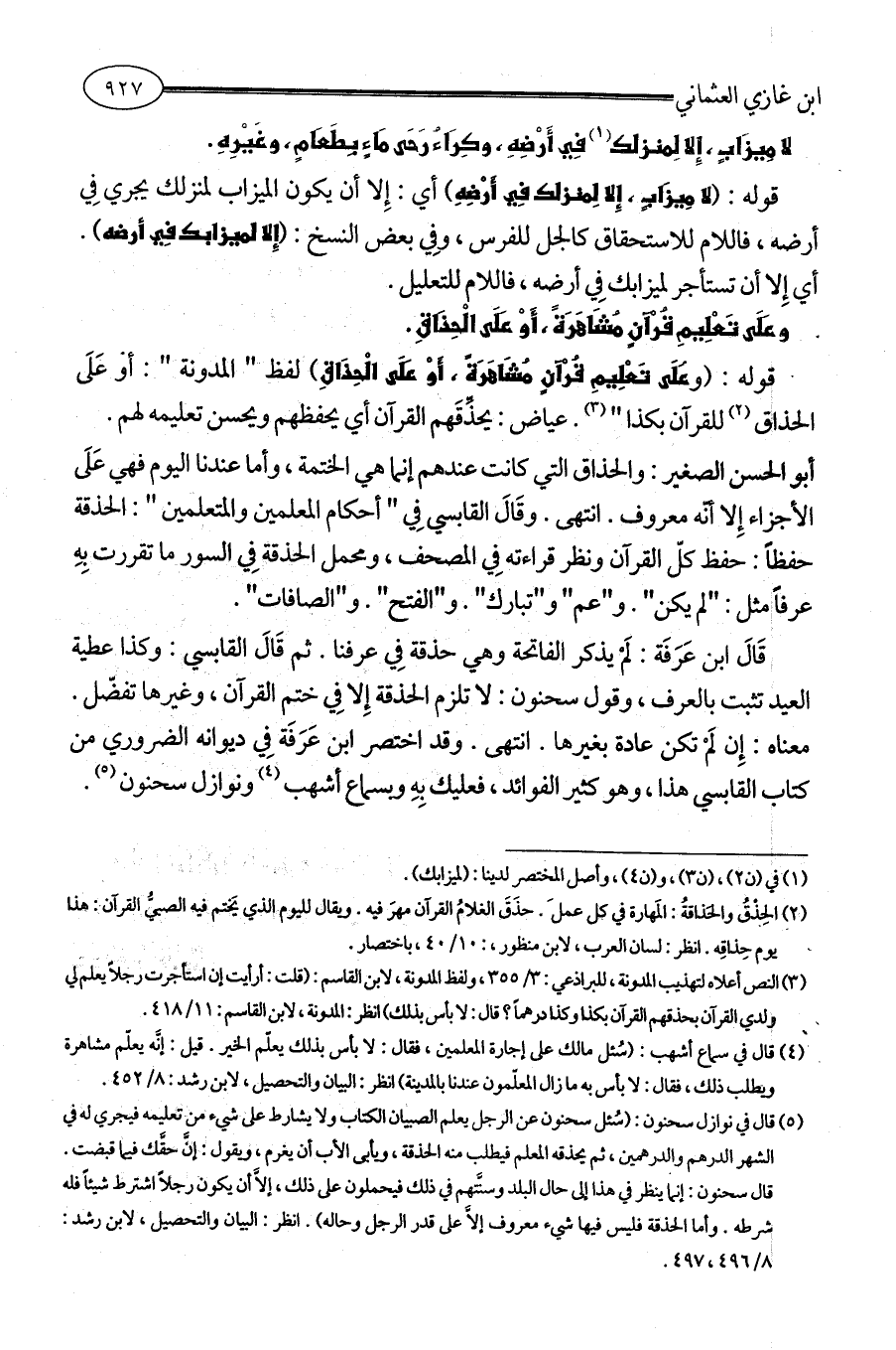 (¬4) قال في سماع أشهب: (سُئل مالك على إجارة المعلمين، فقال: لا بأس بذلك يعلّم الخير. قيل: إنَّه يعلّم مشاهرة ويطلب ذلك، فقال: لا بأس به ما زال المعلّمون عندنا بالمدينة) انظر: البيان والتحصيل، لابن رشد: 8/ 452.