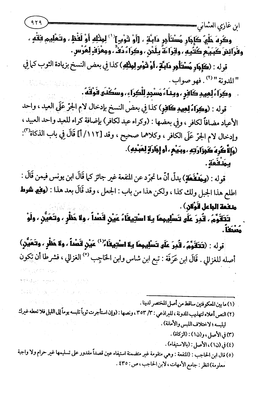 (¬5) قال ابن الحاجب: (المنفعة: وهي متقومة غير متضمنة استيفاء عين قصداً مقدور على تسليمها غير حرام ولا واجبة معلومة) انظر: جامع الأمهات، لابن الحاجب، ص: 435.