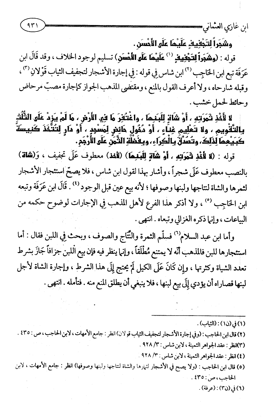 (¬5) قال ابن الحاجب: (ولا يصح في الأشجار لثمارها والشاة لنتاجها ولبنها وصوفها) انظر: جامع الأمهات، لابن الحاجب، ص: 435.