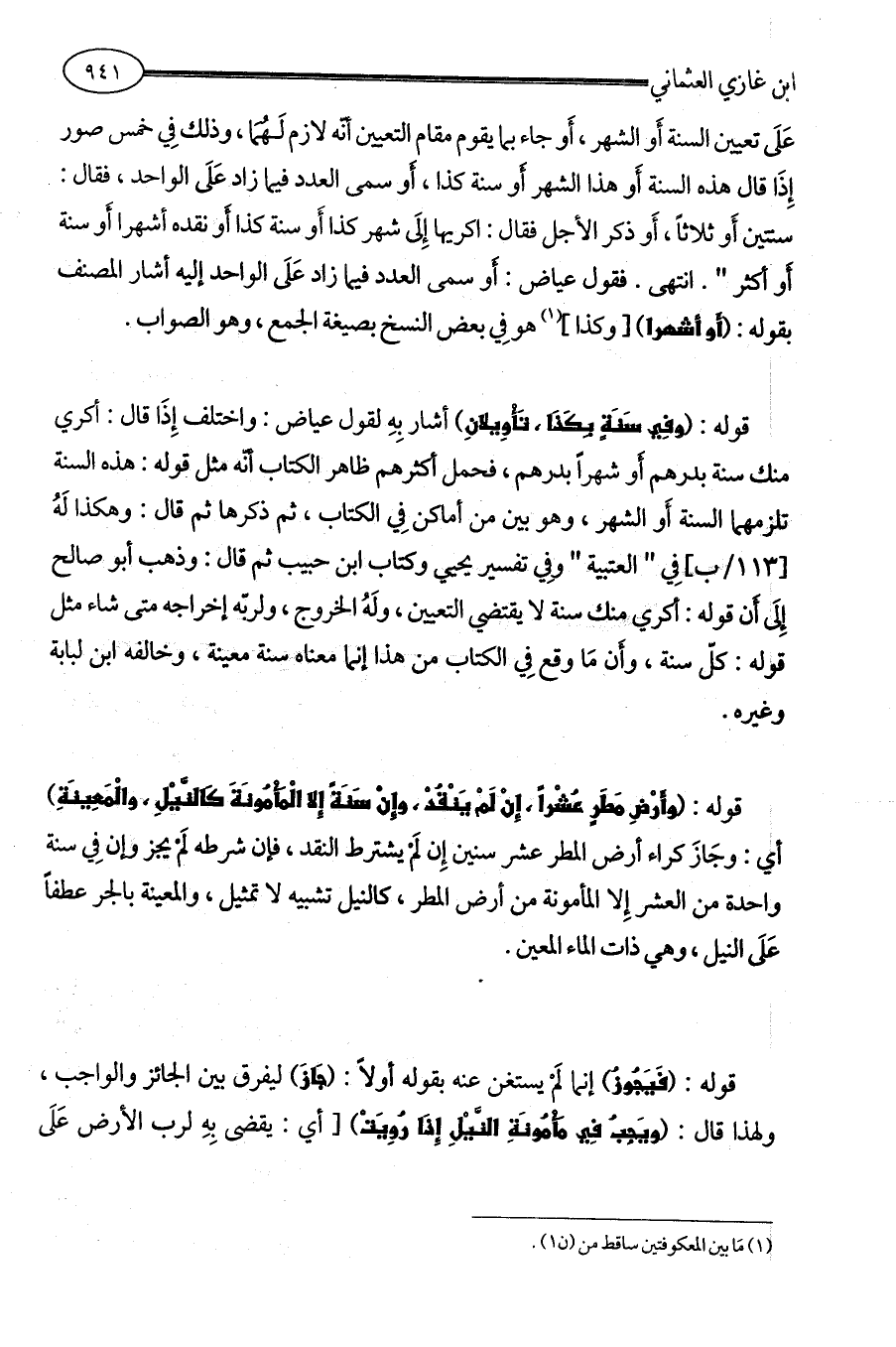قوله: (وَفِي سَنَةٍ بِكَذَا، تَأْوِيلانِ) أشار بِهِ لقول عياض: واختلف إِذَا قال: أكري منك سنة بدرهم أَو شهراً بدرهم، فحمل أكثرهم ظاهر الكتاب أنّه مثل قوله: هذه السنة تلزمهما السنة أَو الشهر، وهو بين من أماكن فِي الكتاب، ثم ذكرها ثم قال: وهكذا لَهُ [113 / ب] فِي " العتبية " وفِي تفسير يحيي وكتاب ابن حبيب ثم قال: وذهب أبو صالح إِلَى أَن قوله: أكري منك سنة لا يقتضي التعيين، ولَهُ الخروج، ولربّه إخراجه متى شاء مثل قوله: كلّ سنة، وأَن مَا وقع فِي الكتاب من هذا إنما معناه سنة معينة، وخالفه ابن لبابة وغيره.